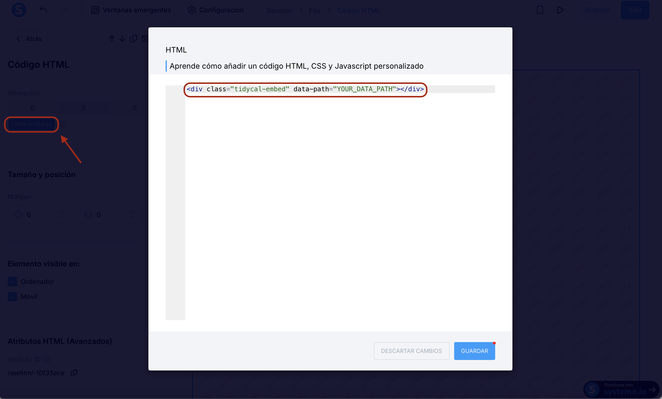 2. Primero, agrega un elemento código HTML a tu ventana emergente. Luego, copia la siguiente línea de tu código de TidyCal: <div class="tidycal-embed" data-path="YOUR_DATA_PATH"></div> y pégalo dentro de tu elemento HTML.