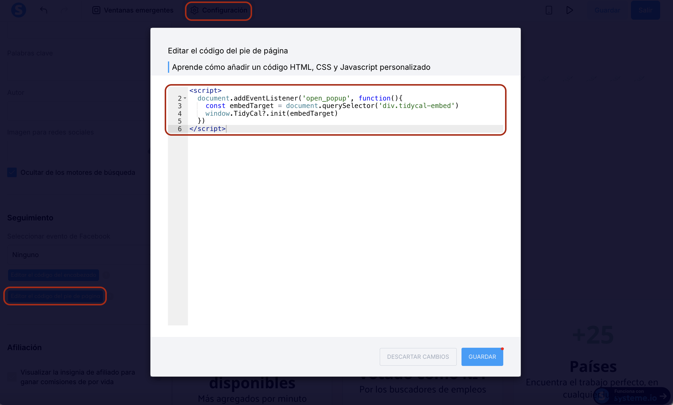 - Luego, ve a la configuración de la página y haz clic en "Editar código del pie de página". Tienes que pegar el resto del código proporcionado por TidyCal