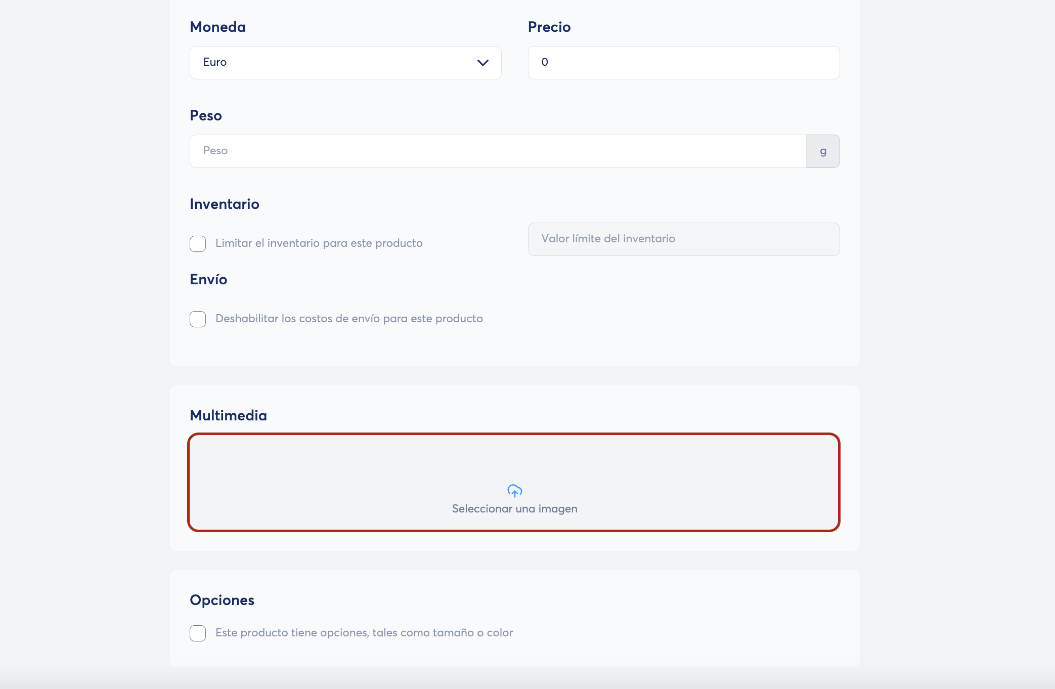 También puedes cargar imágenes del producto para mostrar en tu página de ventas.