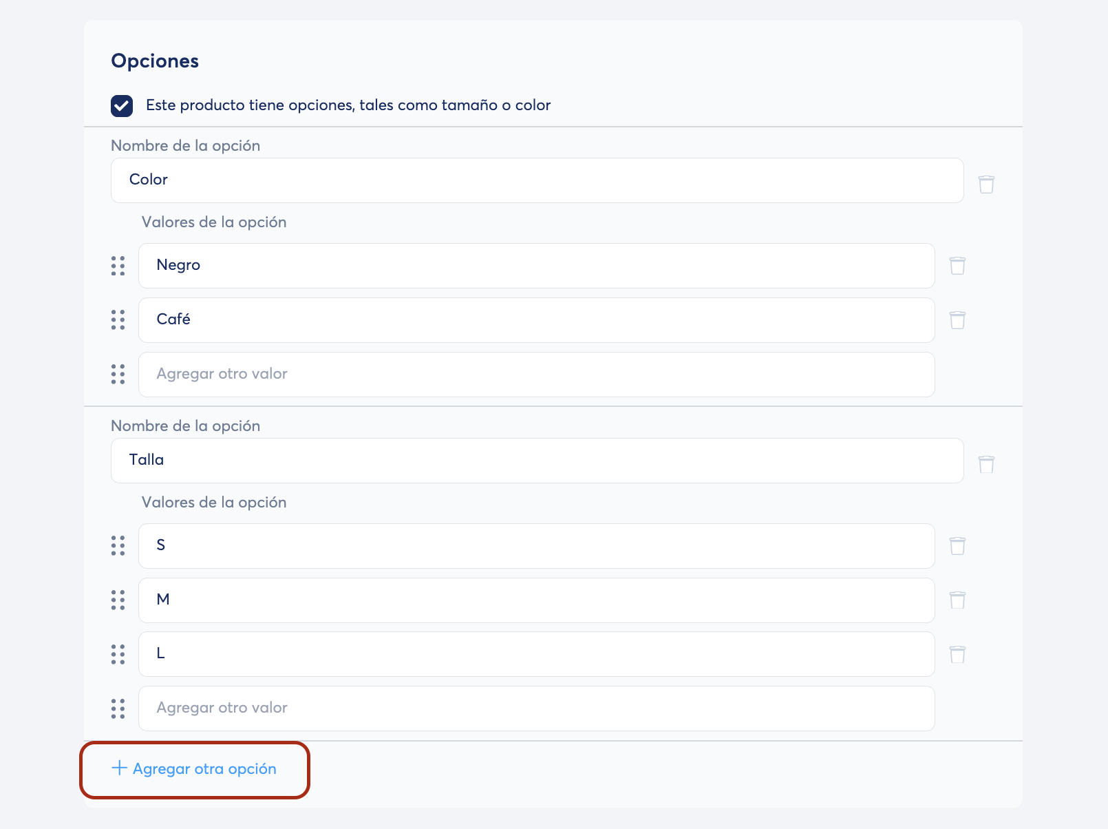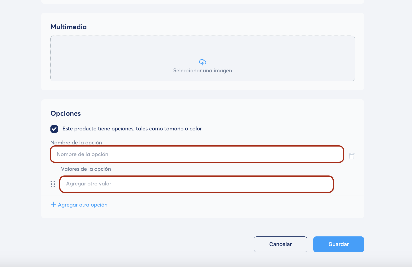 Para crear una opción para el producto, simplemente agrega un nombre y un valor.