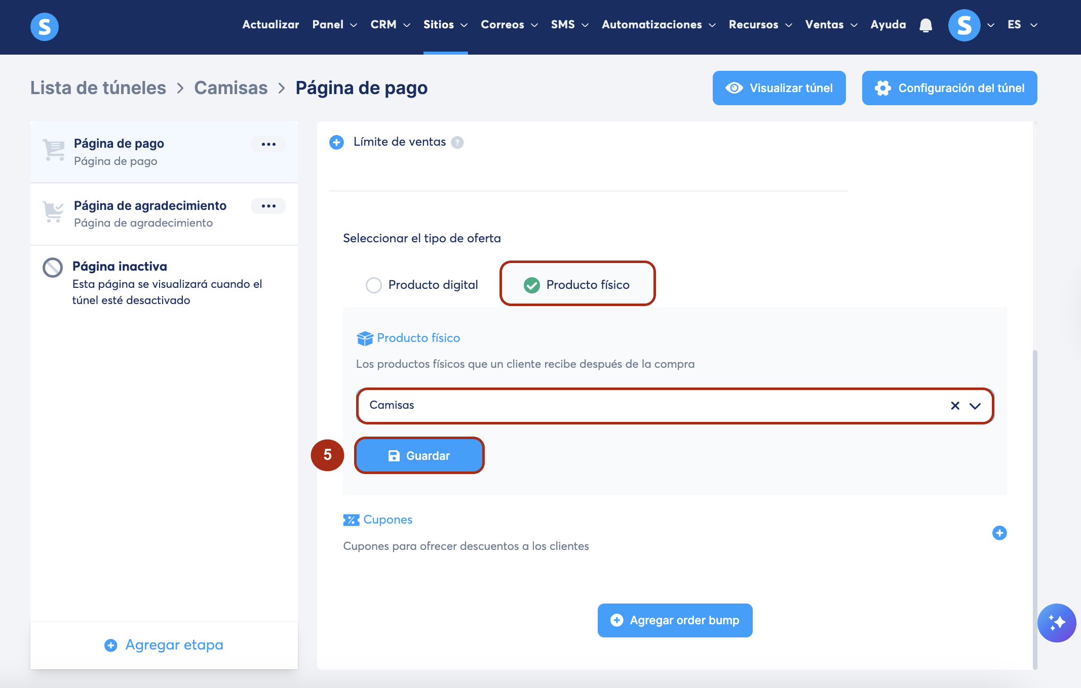Selecciona Producto físico como tipo de oferta. Luego, selecciona tu producto específico (ej., "Camisas") y haz clic en Guardar (5).