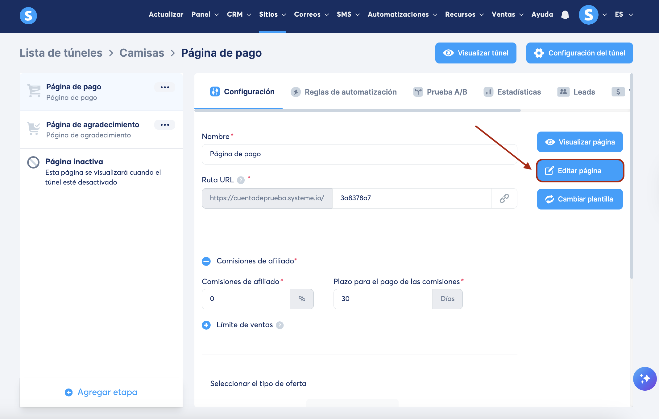 En la misma página, haz clic en Editar página para acceder al editor de la página de pago.