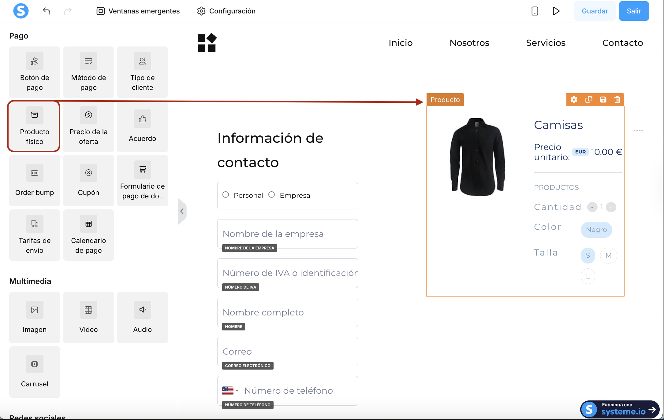 Decide en dónde deseas que tu producto aparezca. Luego, arrastra el elemento Producto físico desde la sección Pago (en la barra izquierda) y suéltalo en la página.