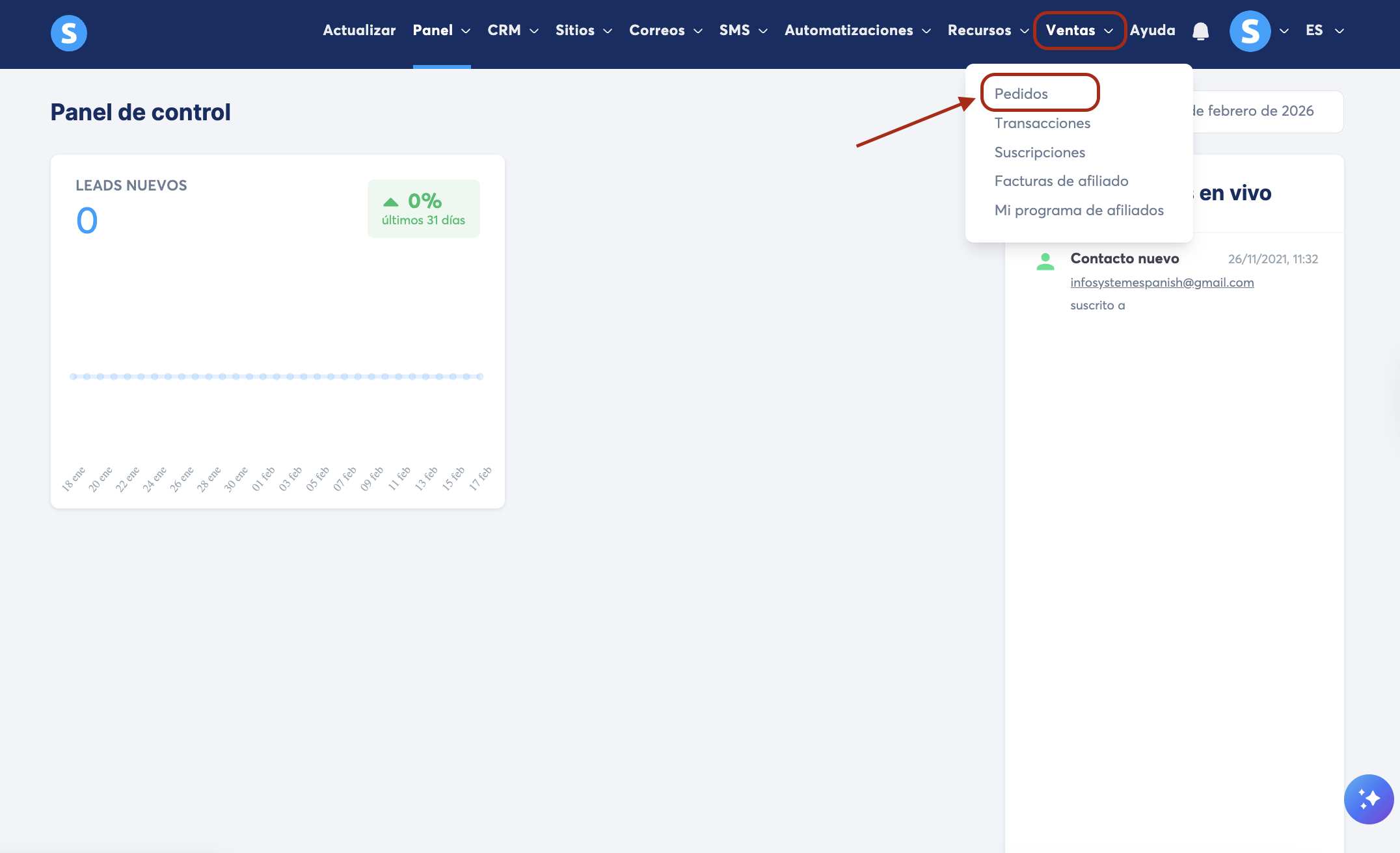 Por último, en tu cuenta de systeme.io puedes encontrar todos los pedidos de tus clientes. Para hacerlo ve a Productos y luego a Pedidos.