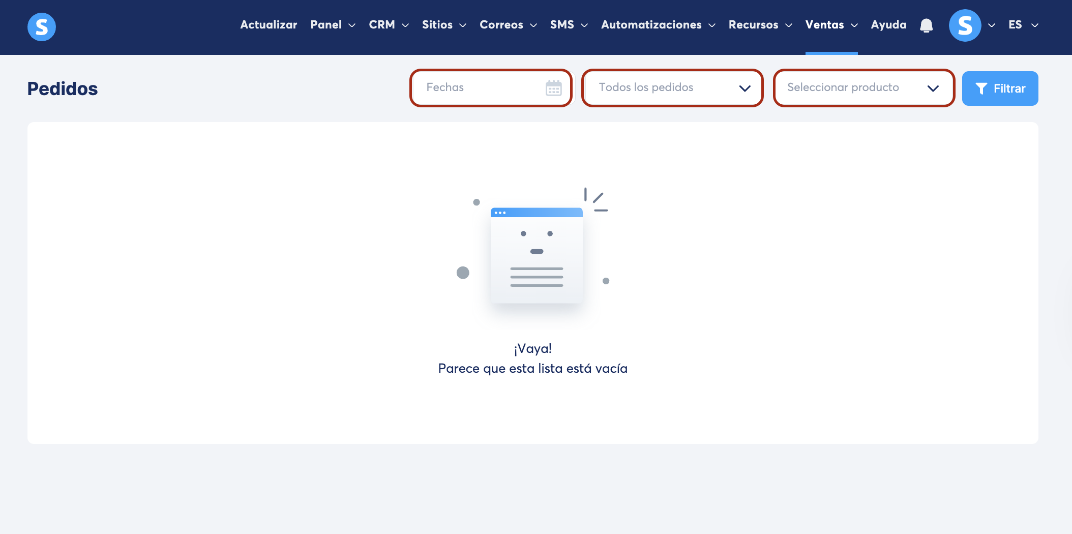 Esta página muestra todos los pedidos de los clientes. Puedes filtrar resultados por fecha, tipo, estado o producto. Puedes usar esta configuración individualmente o al mismo tiempo.