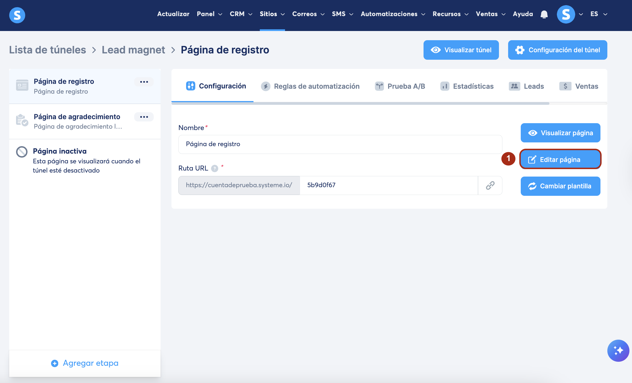 Explora tu túnel de ventas y haz clic en Editar página (1) para abrir el editor.