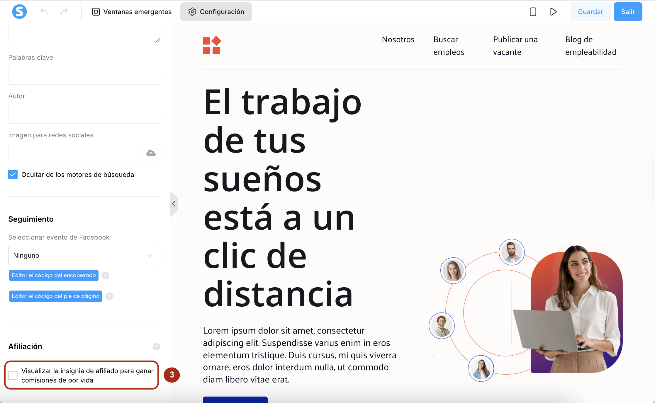 Desplázate en el menú de configuración hasta la casilla Visualizar una insignia de afiliado para ganar comisiones de por vida (3).