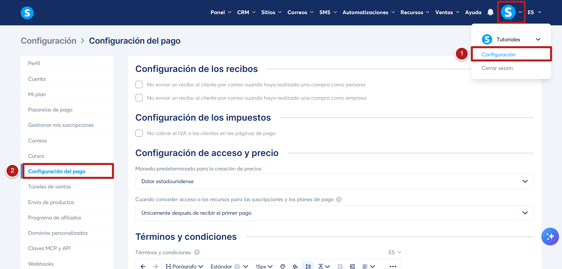 Para modificar el texto de los términos y condiciones en tus páginas de pago, ve a Configuración (1) haciendo clic en tu foto de perfil, luego haz clic en Configuración del pago (2).