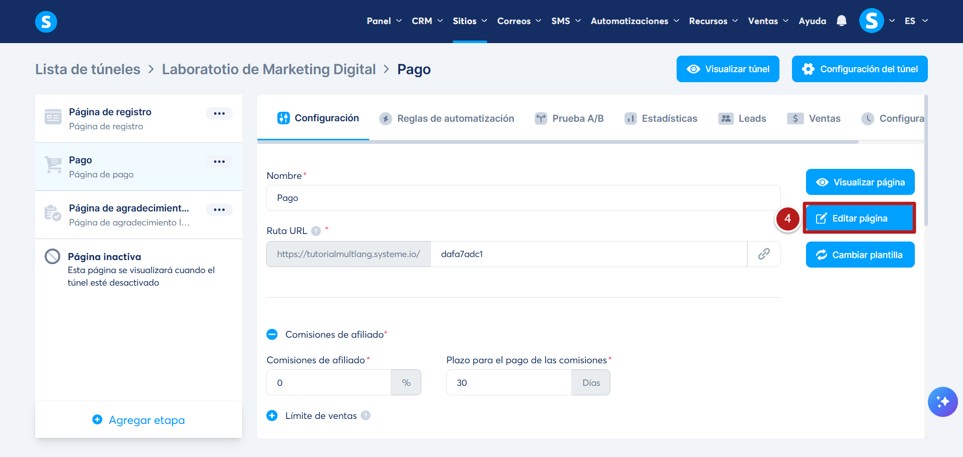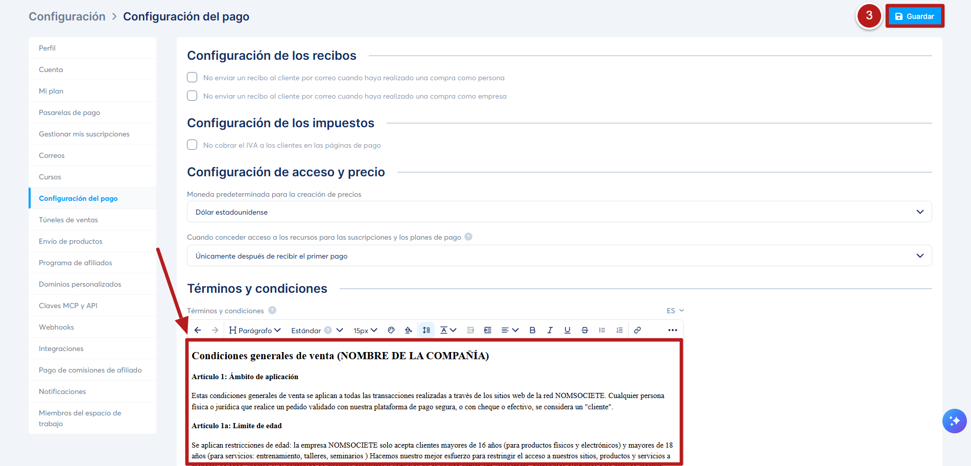 Para incluir estos términos, abre el editor de tu página de pago (4).