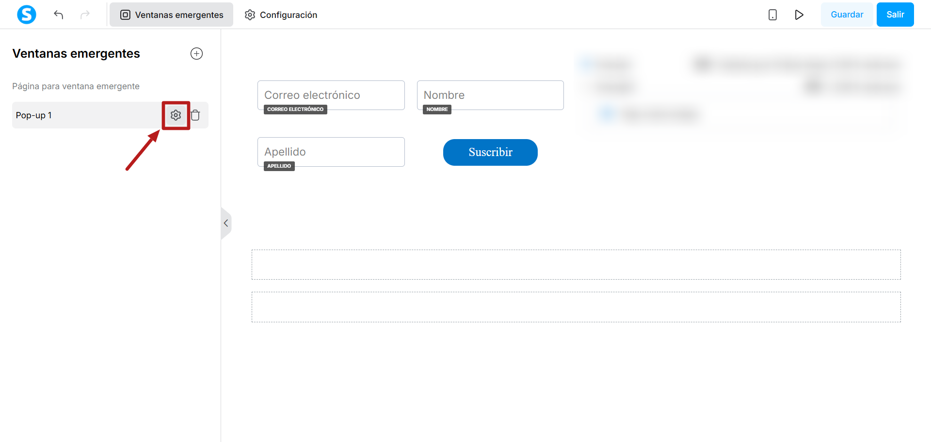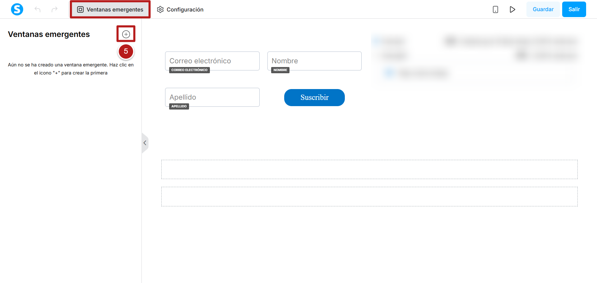 Una vez dentro del editor, haz clic en Ventanas emergentes, luego haz clic en el icono + (5) para añadir una nueva ventana emergente.