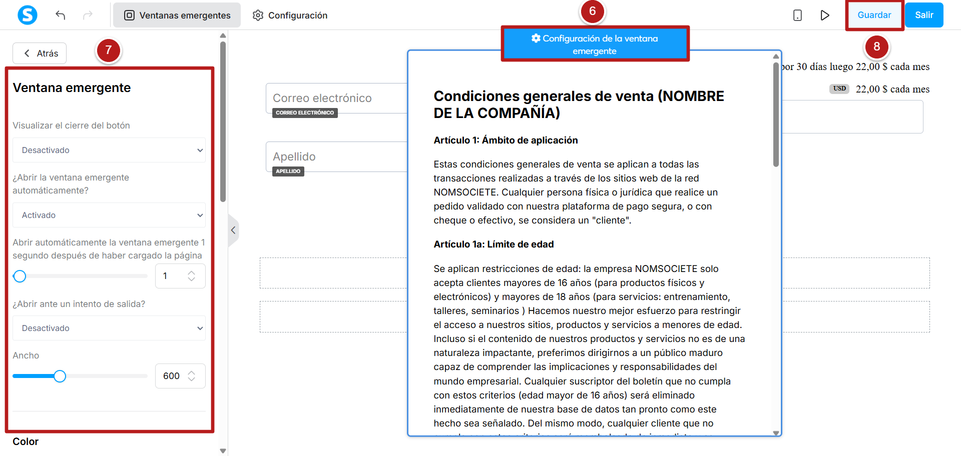 Una vez que la ventana emergente se despliegue, haz clic en Configuración de la ventana emergente (6) y selecciona el elemento de texto que contiene los términos y condiciones (7).