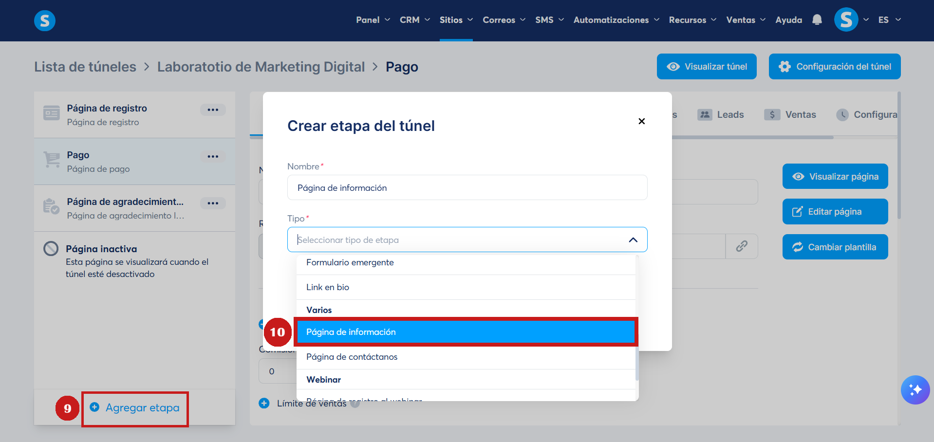 Comienza creando una nueva página para tus términos. Haz clic en Agregar etapa (9) y selecciona Página de información (10) como tipo de página.
