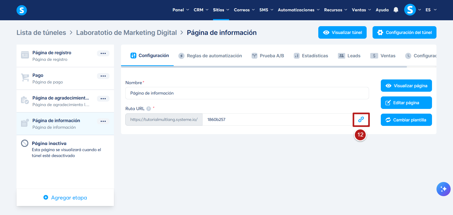 Pega la URL de tu página de información (14), luego haz clic en Confirmar (15).