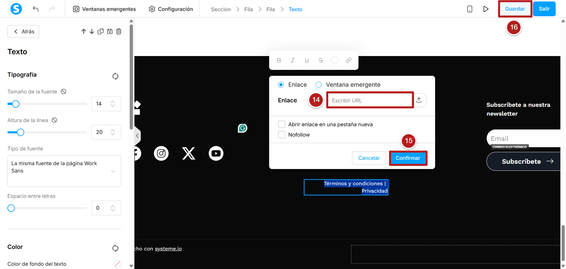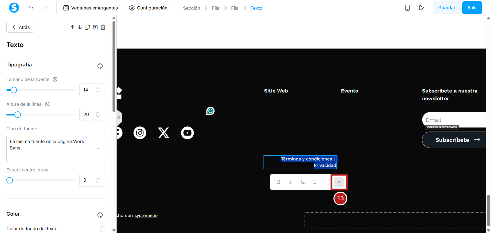 En el editor de tu página de ventas, añade un elemento de texto. Resalta el texto y haz clic en el icono Enlace para crear un hipervínculo (13).