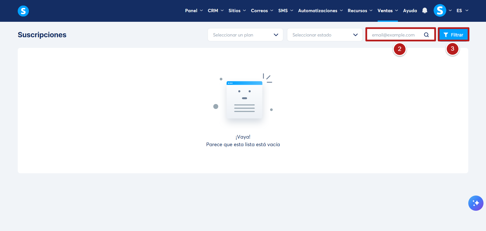 En el campo de búsqueda, ingresa la dirección de correo electrónico del suscriptor (2), luego haz clic en Filtrar (3).