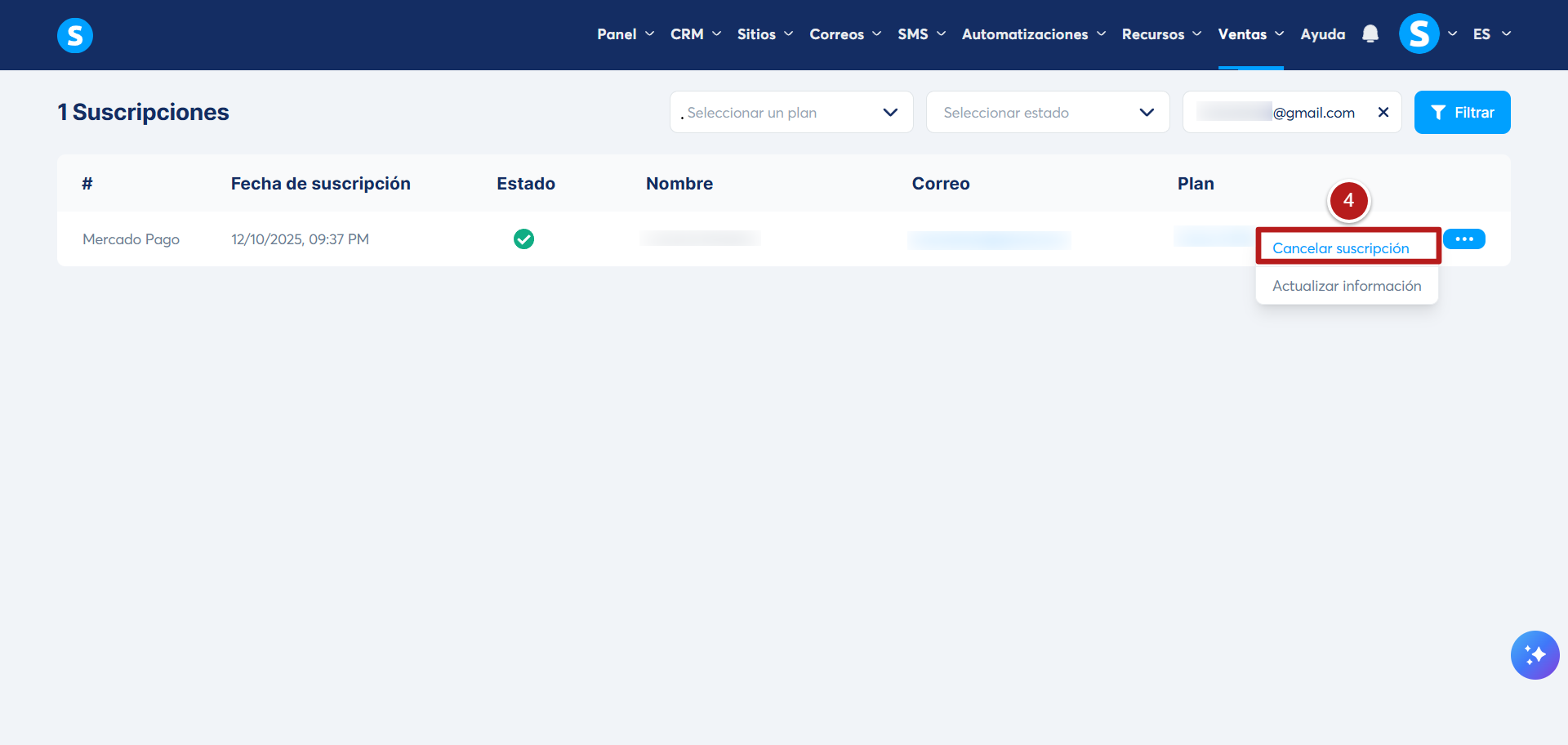 Finalmente, haz clic en el menú de tres puntos junto a la suscripción que deseas terminar y selecciona Cancelar suscripción (4).