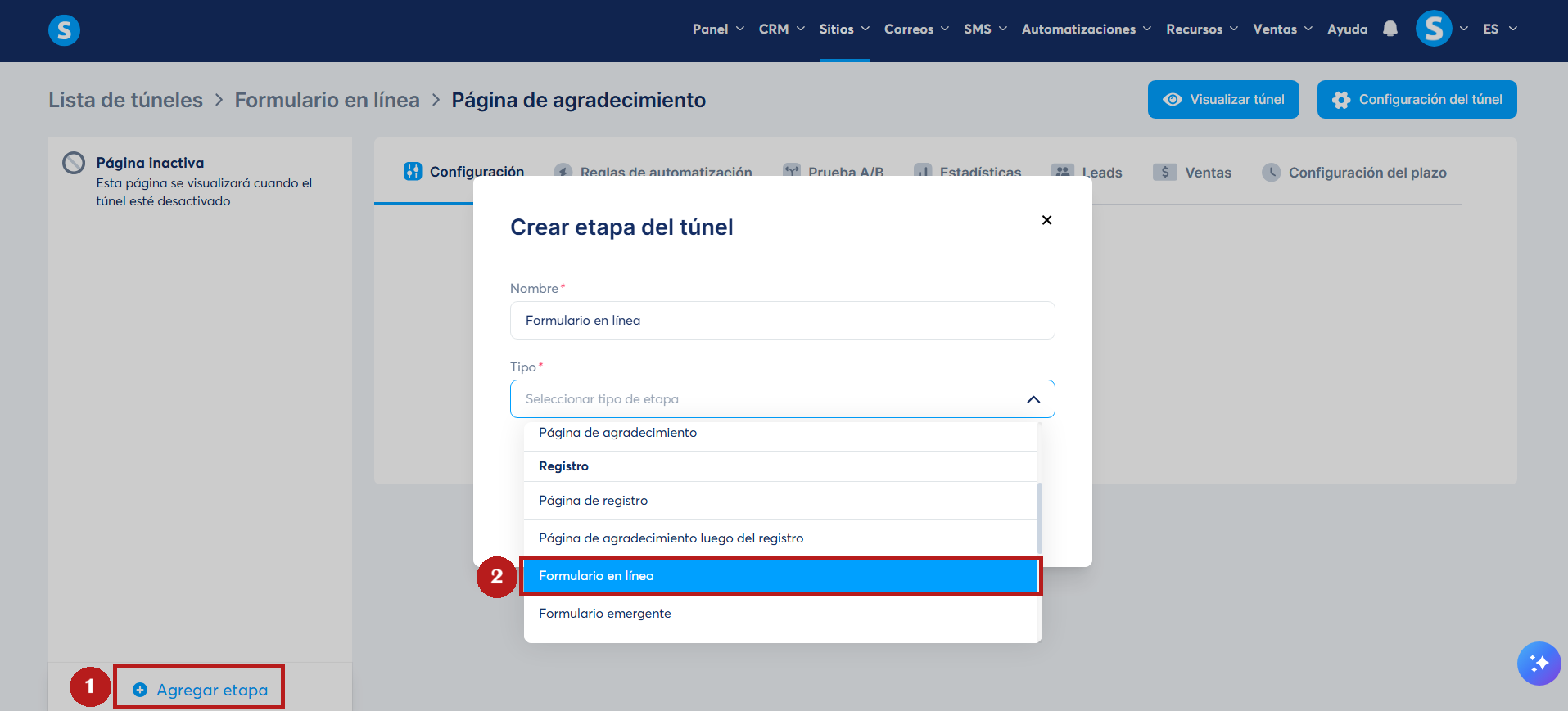 Paso 1: En tu túnel de ventas, haz clic en el botón Agregar paso (1), luego selecciona Formulario en línea (2) en la categoría Registro.