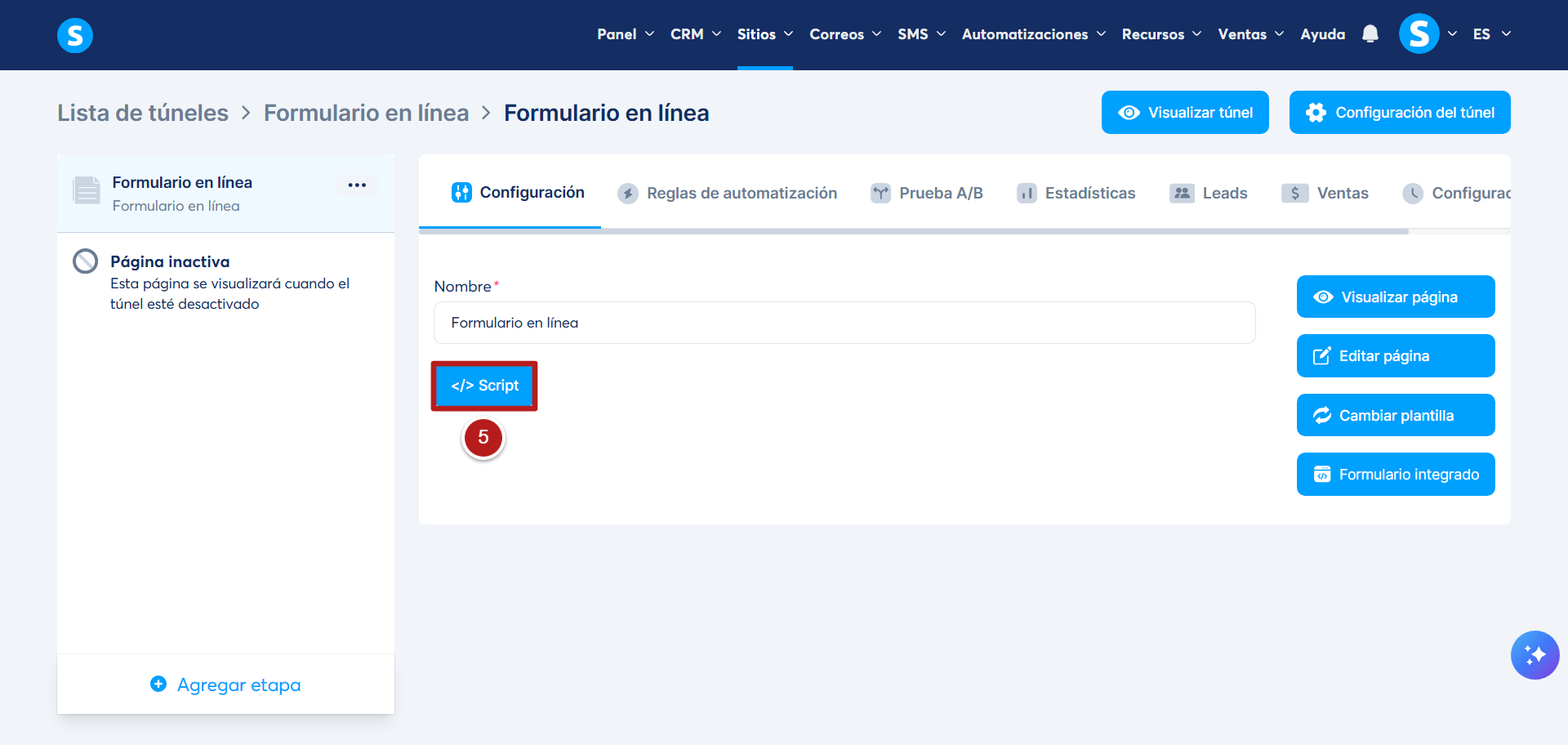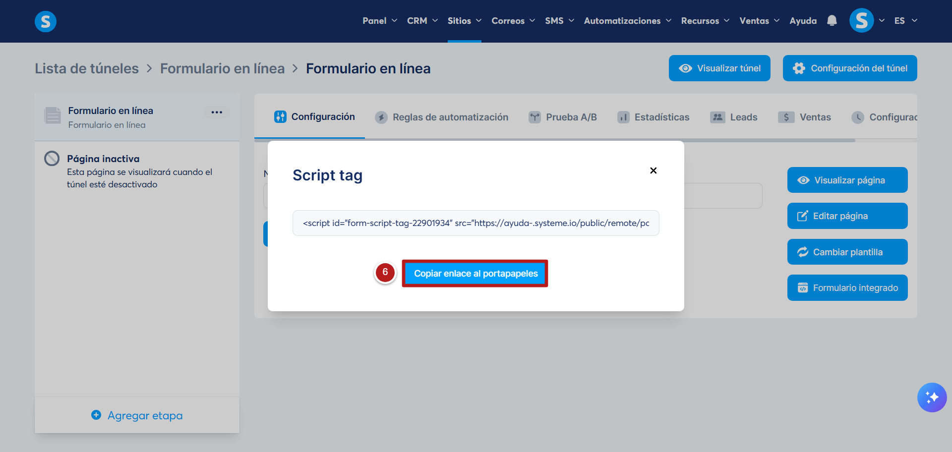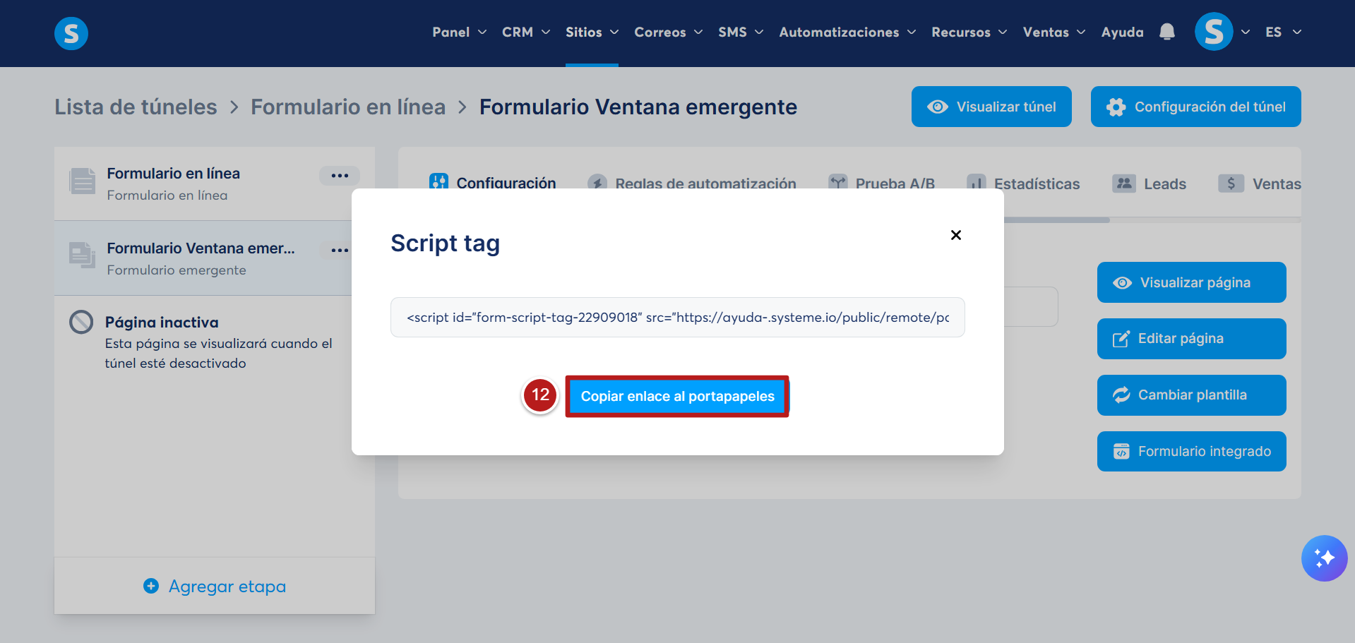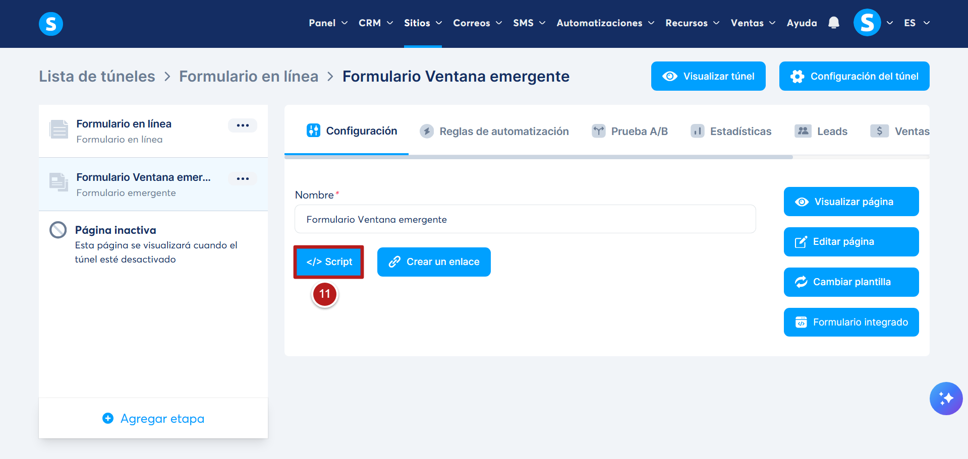 Paso 2: Una vez que hayas terminado la configuración de tu formulario emergente, para poder colocarlo en tu sitio externo debes copiar el script de tu formulario emergente haciendo clic en Script (11).