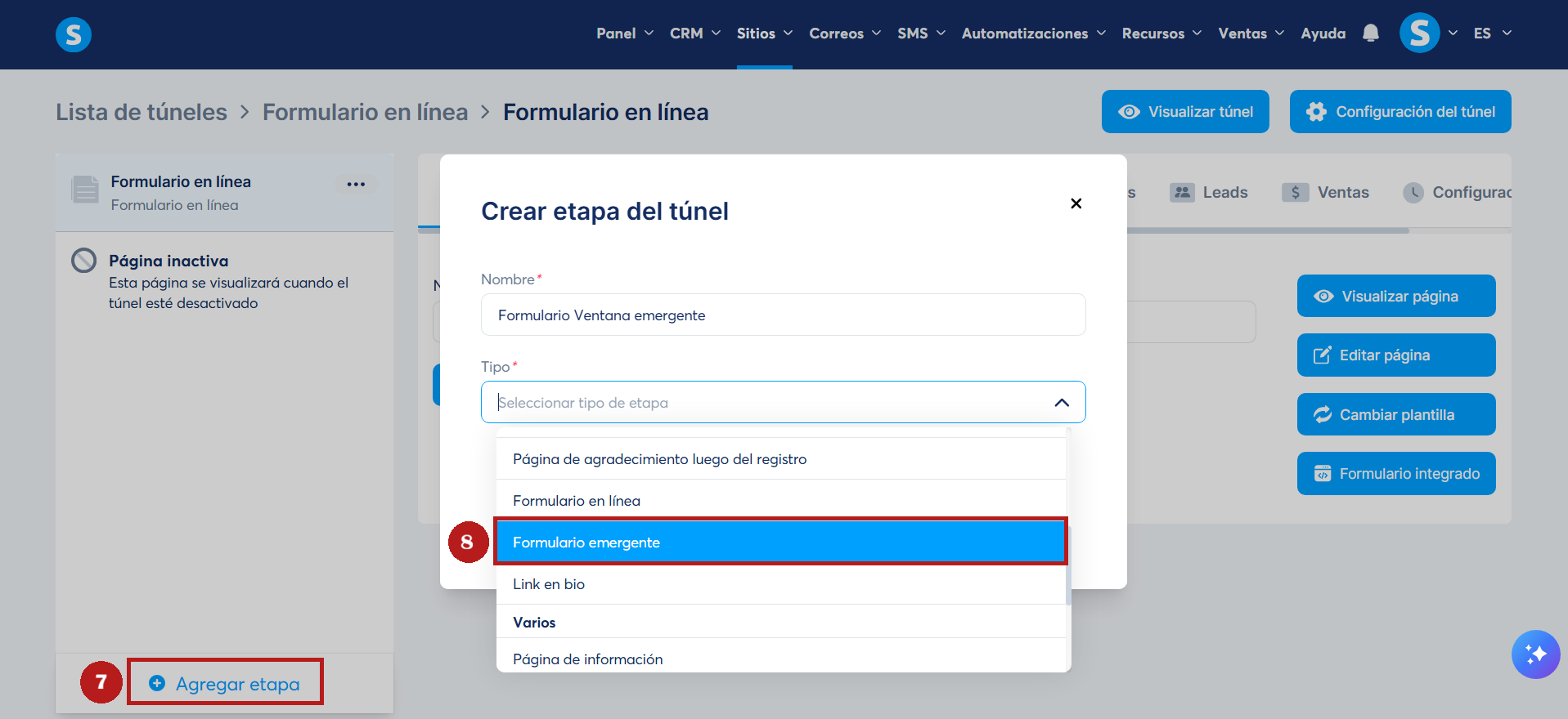 Paso 1: En tu túnel de ventas, haz clic en Agregar paso (7), luego selecciona Formulario emergente (8) en la categoría Suscripción.
