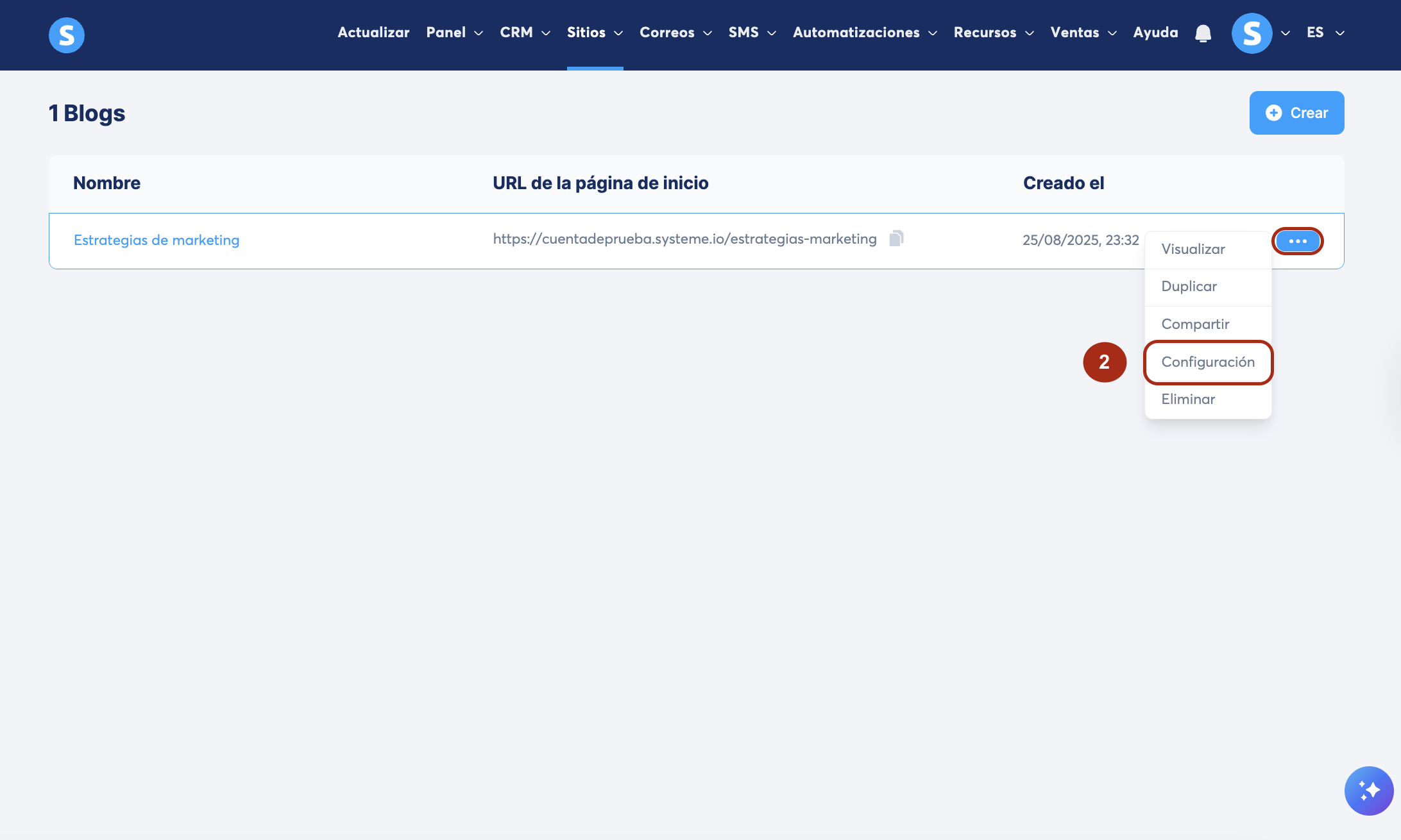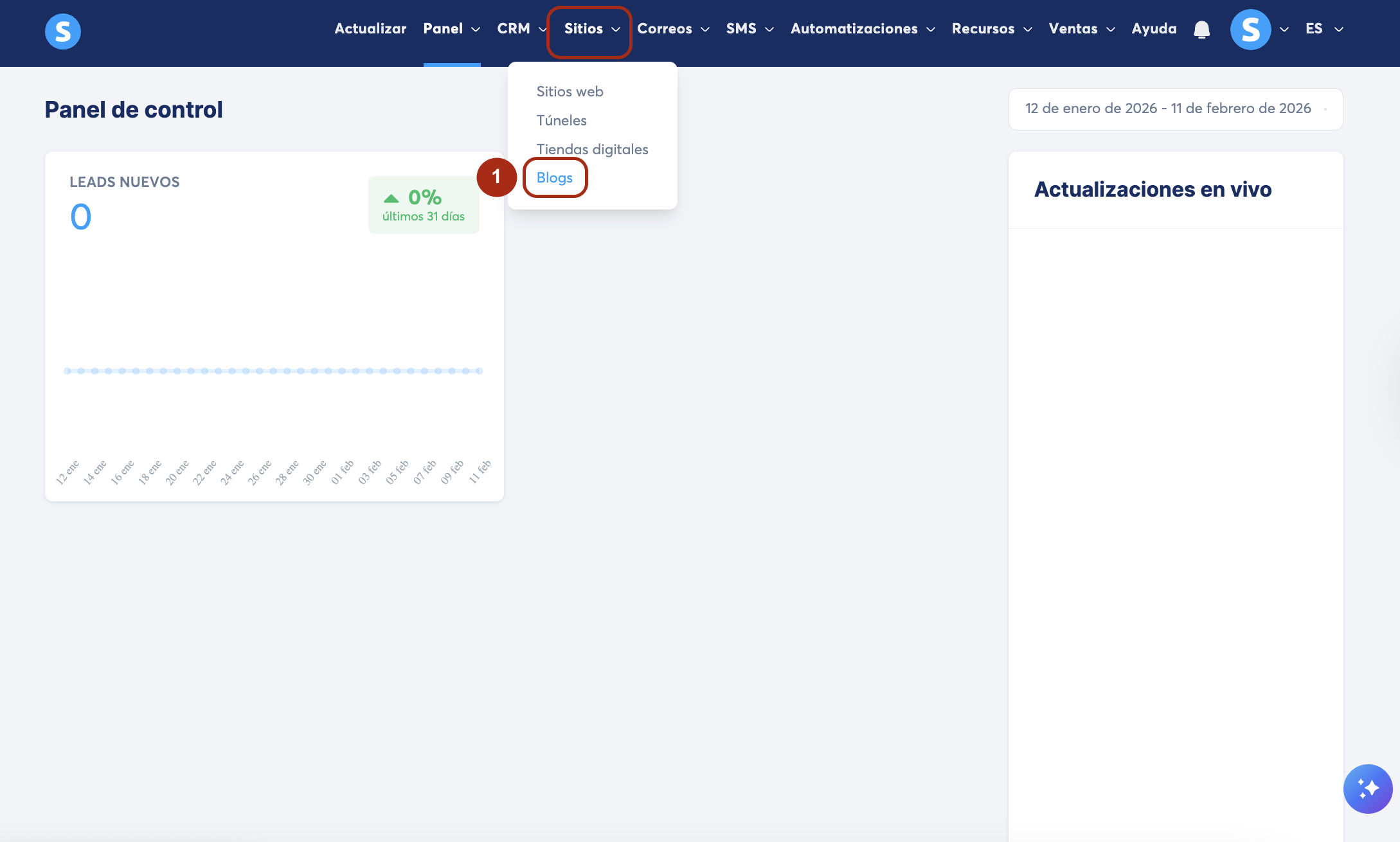 Ve a la pestaña Sitios en tu menú, haz clic en Blogs (1).