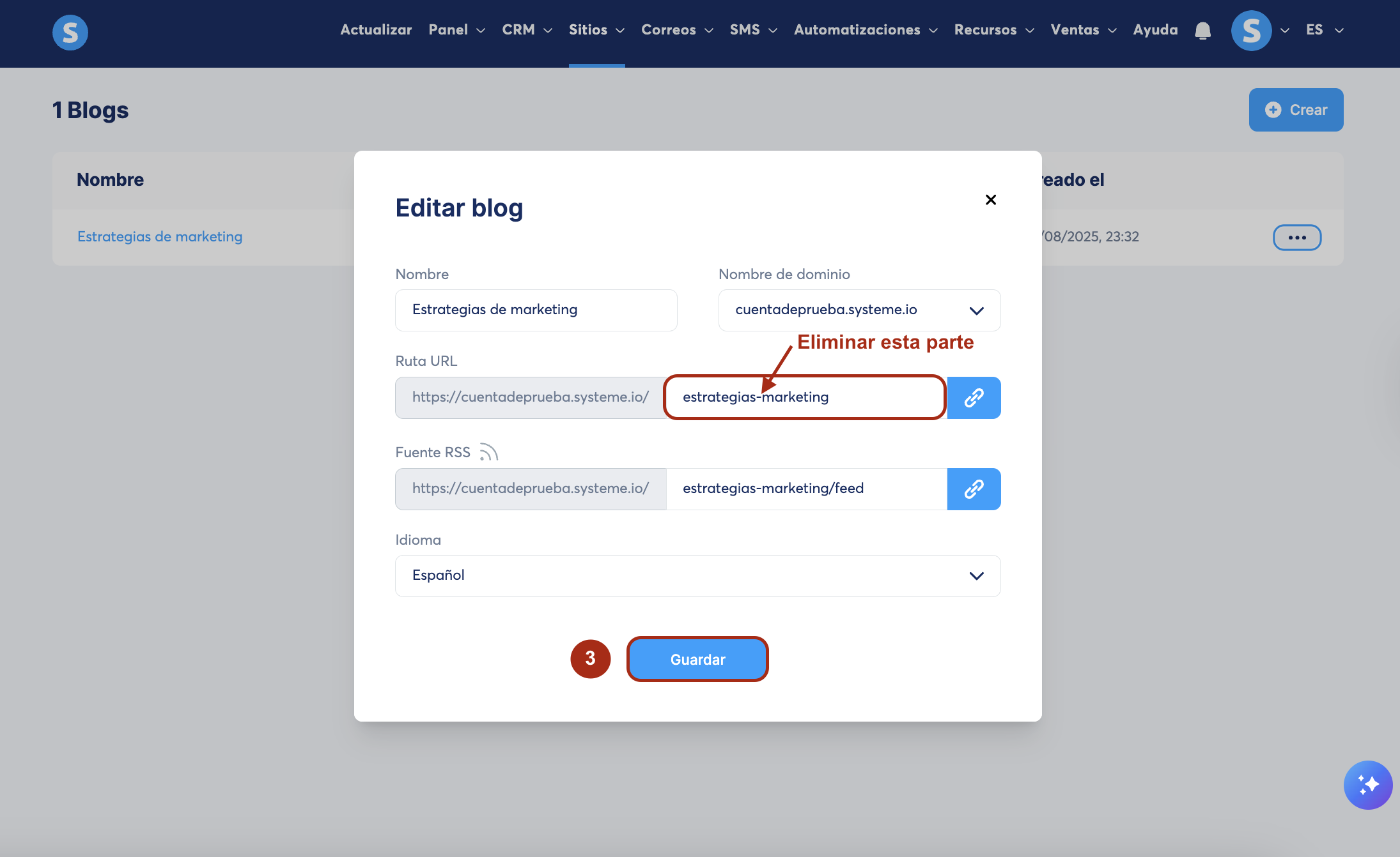 Elimina el texto del campo Ruta de URL (deja el campo vacío) y haz clic en Guardar (3).