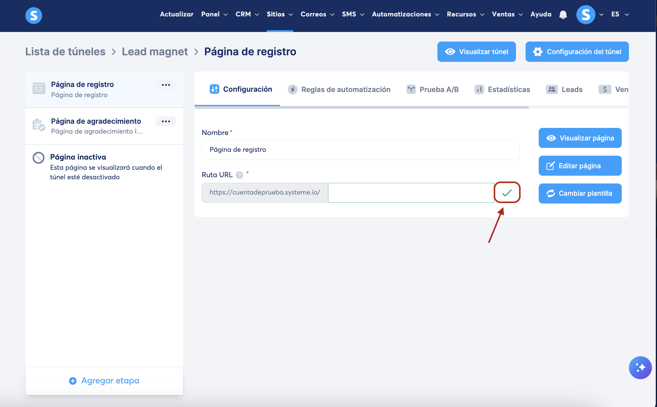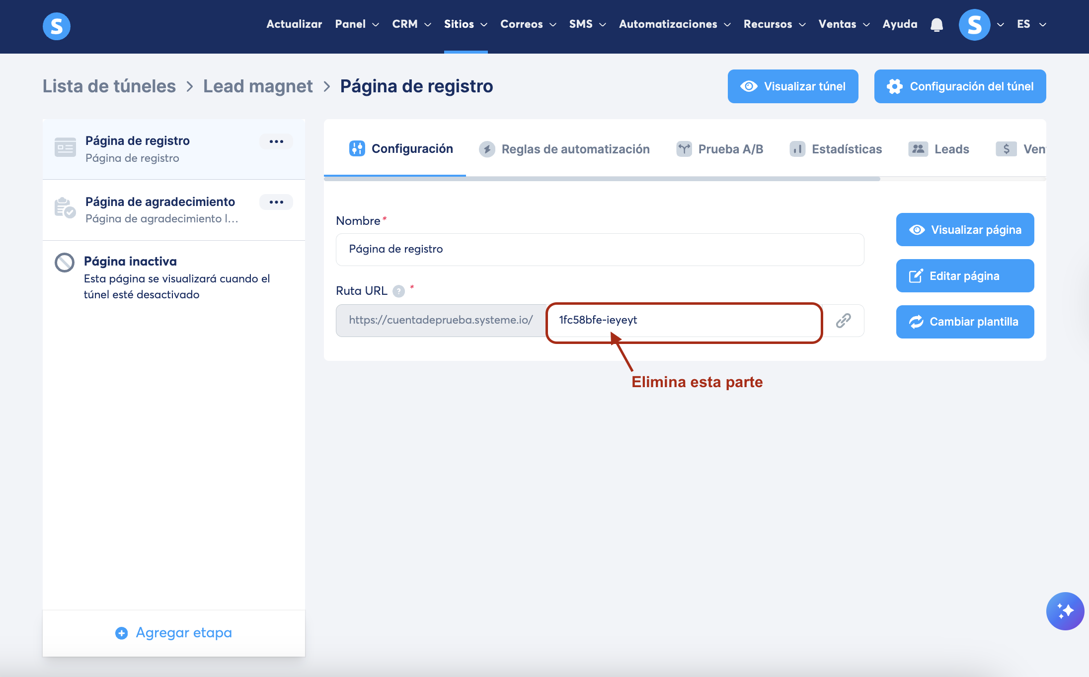 Ve a la página del túnel de ventas que deseas establecer como tu página de inicio y elimina el texto del campo Ruta de URL (deja el campo vacío).