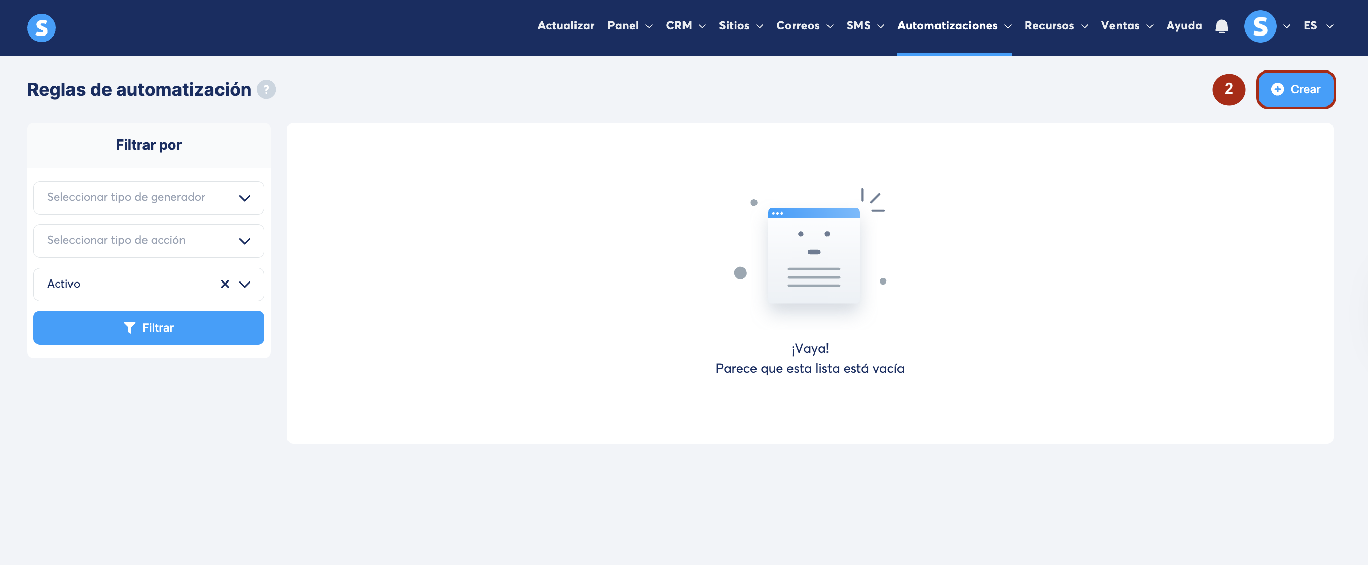 Haz clic en Crear para crear una nueva regla de automatización (2).