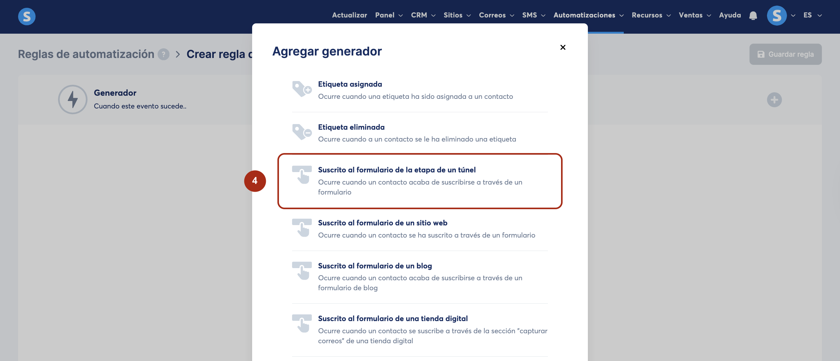 1) Para enviar a los prospectos que se registraron una página de registro, selecciona Suscrito al formulario de la etapa de un túnel (4) y luego selecciona el título de tu página.