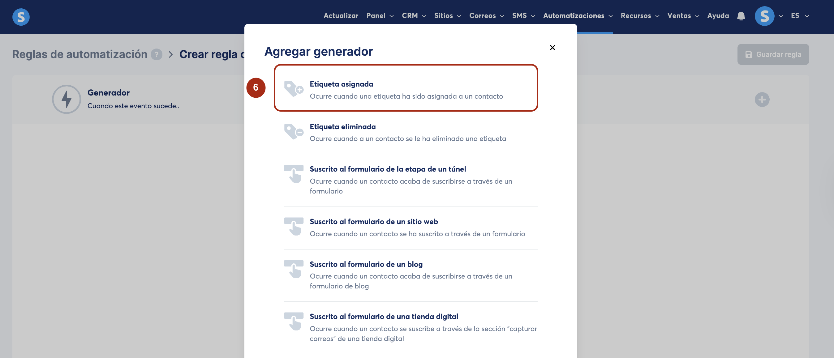 3) Para enviar a los contactos a quienes se les ha asignado una etiqueta específica, selecciona la opción Etiqueta asignada (6)
