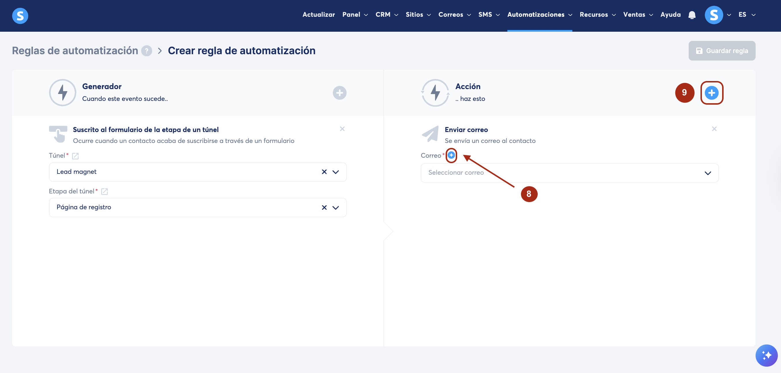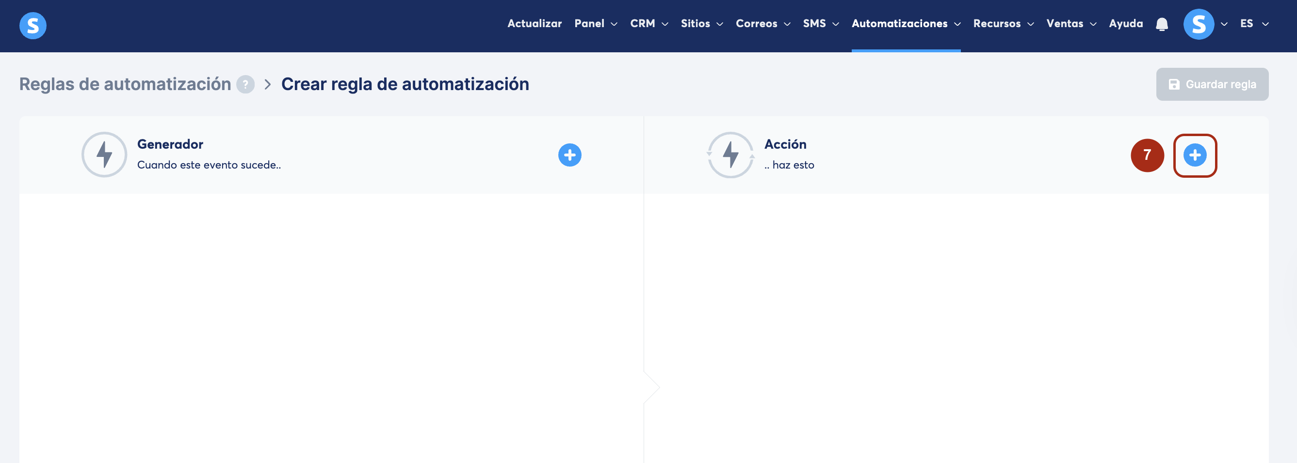 Para agregar acciones, haz clic en el ícono azul + al lado de Acción (7).