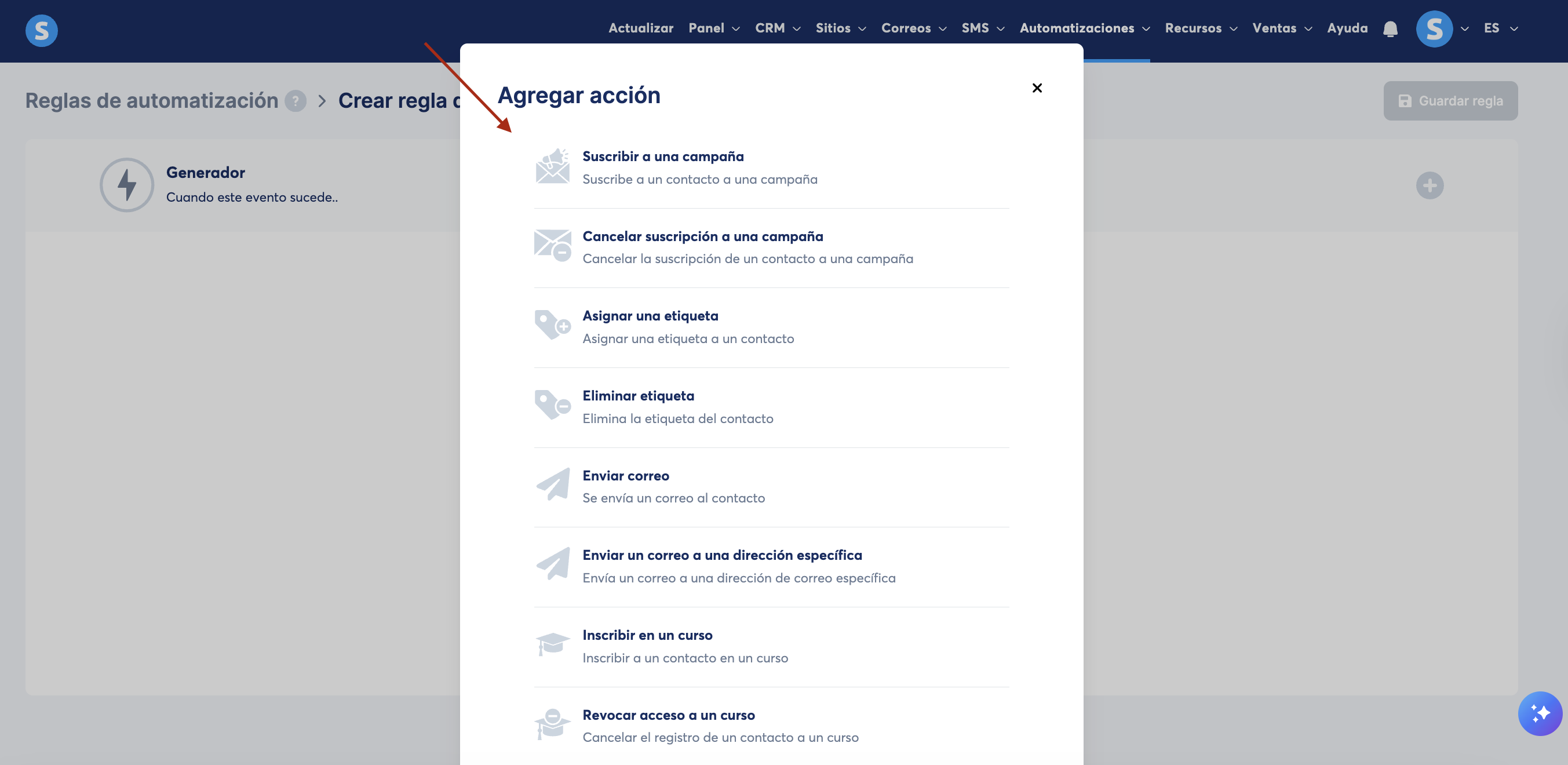 Dentro del editor de la regla, vas a ver dos columnas: Generador y Acción.