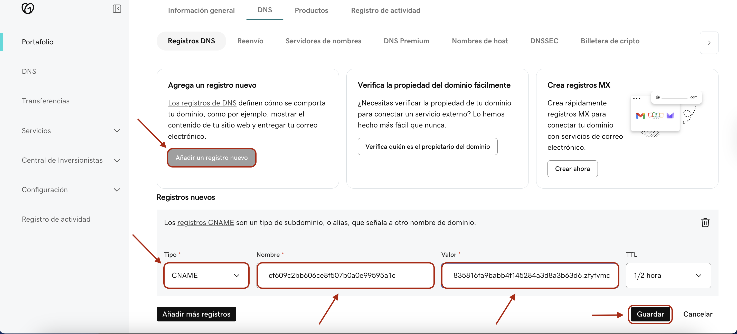 - Sigue el mismo proceso descrito anteriormente para agregar un nuevo registro CNAME.