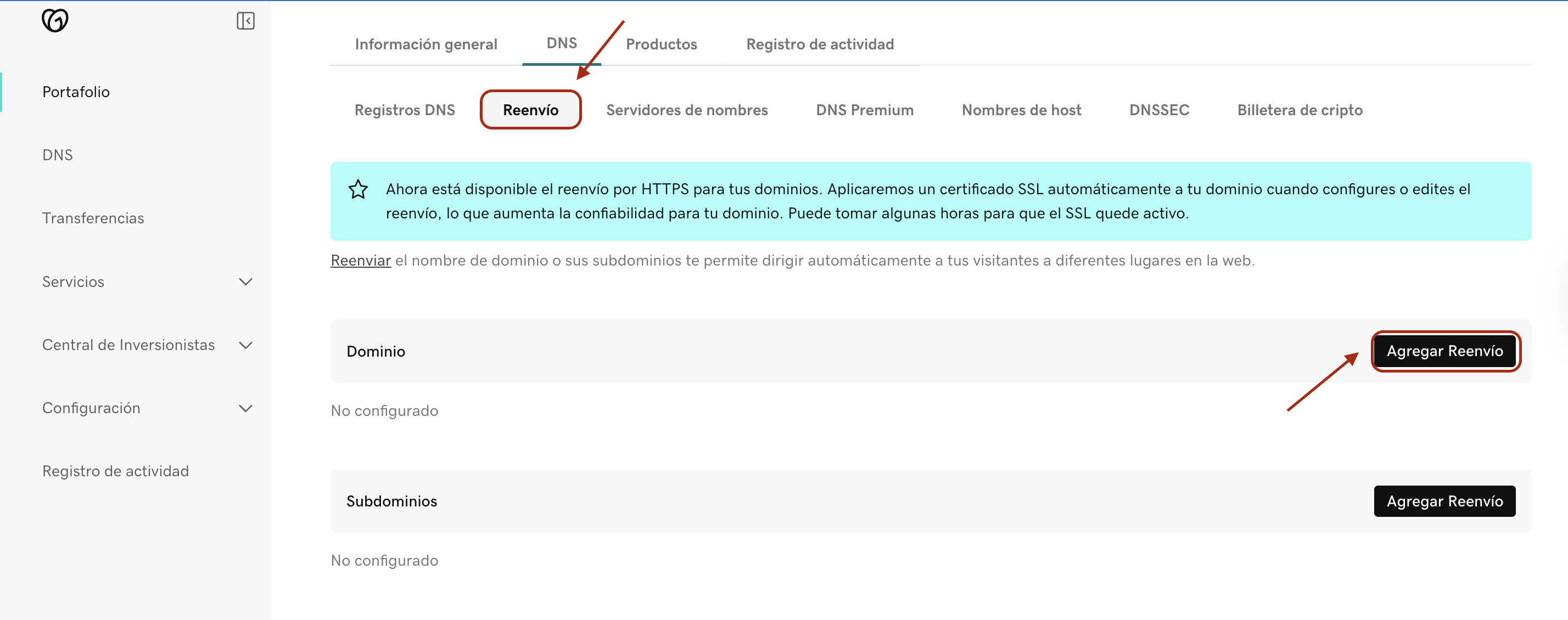 - Haz clic en Reenvío, luego en Agregar Reenvío para un dominio.