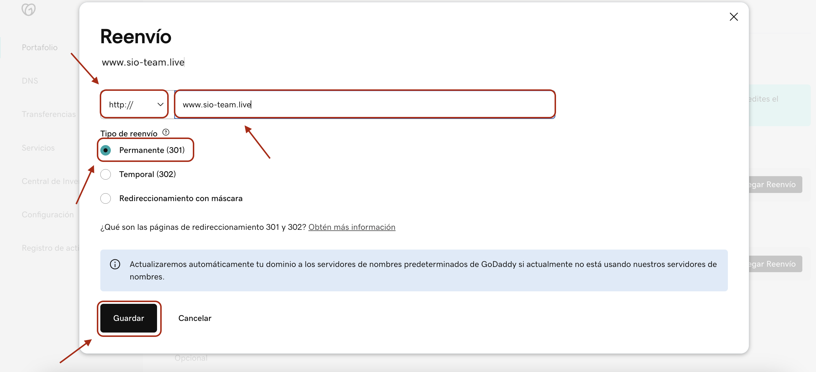 - Ingresa tu dominio completo (ej, www.sio-team.live) en el campo URL de Destino.