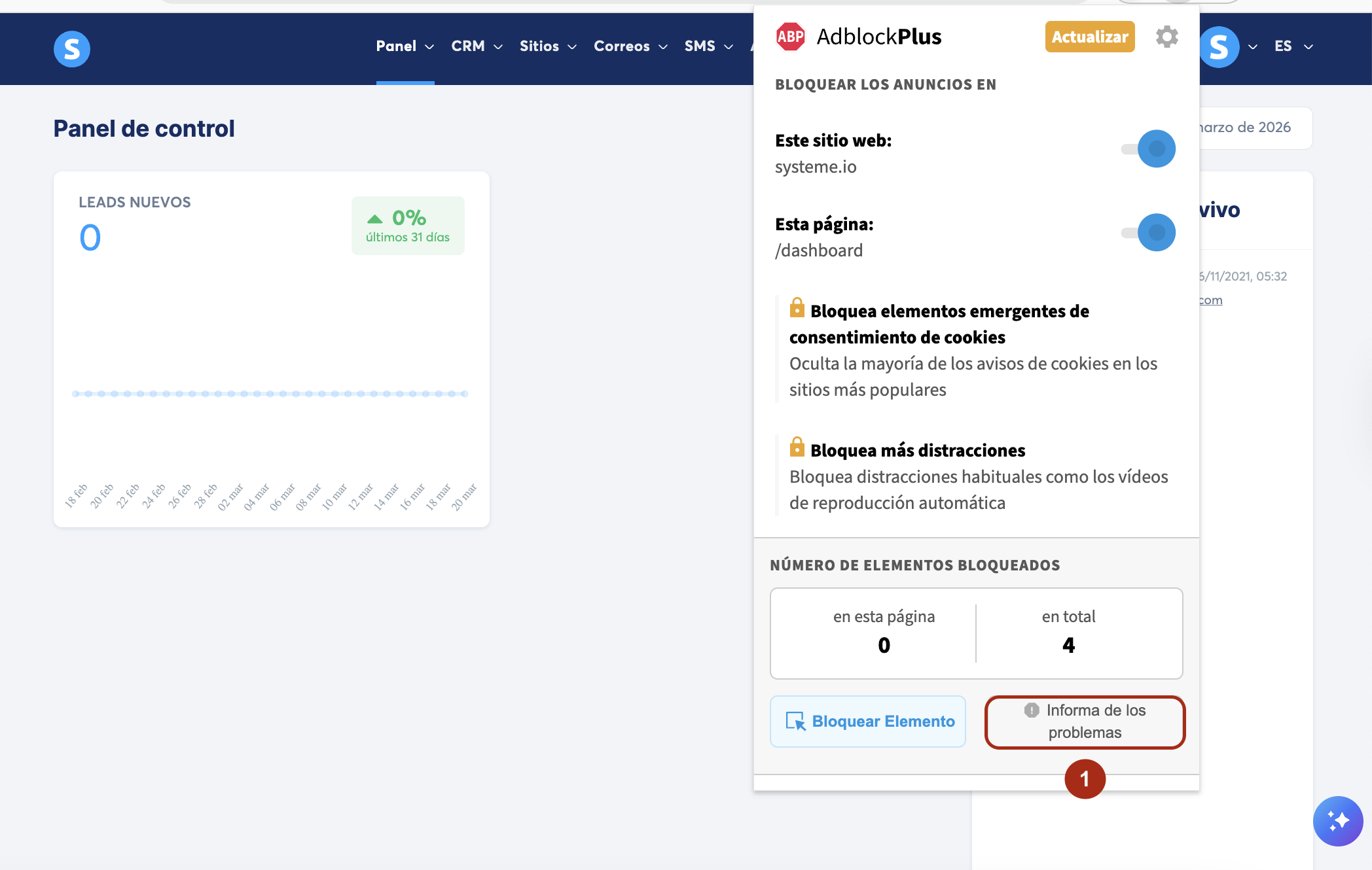Haz clic en el logo de Adblock Plus en la barra de herramientas de tu navegador, luego haz clic en Informa de los problemas (1).