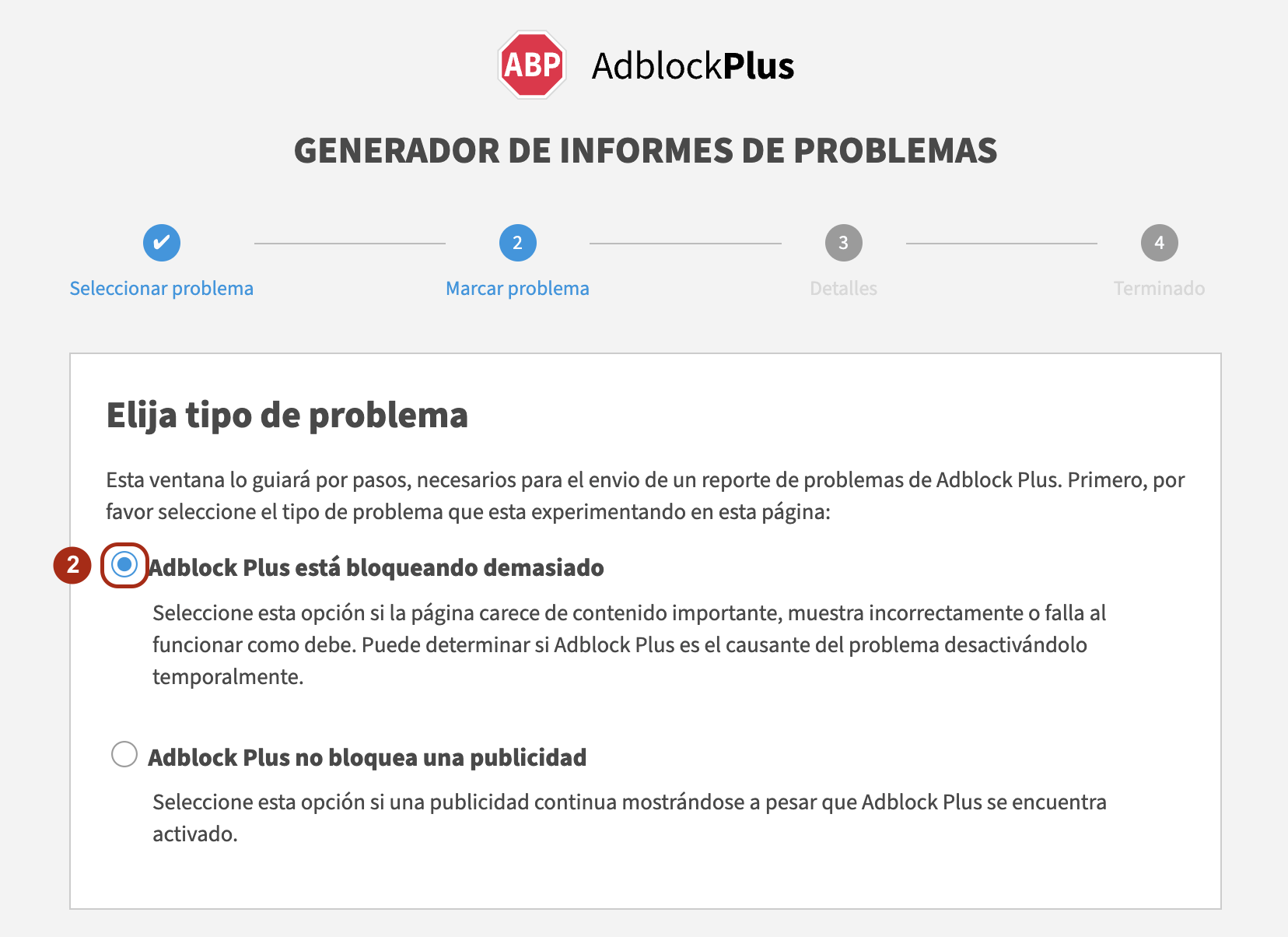 Luego, selecciona la casilla "Adblock Plus está bloqueando demasiado" (2) y haz clic en Continuar.