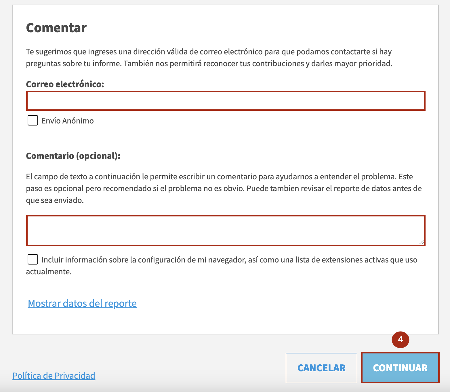Finalmente, ingresa tu correo electrónico, deja un comentario y haz clic en Continuar (4).