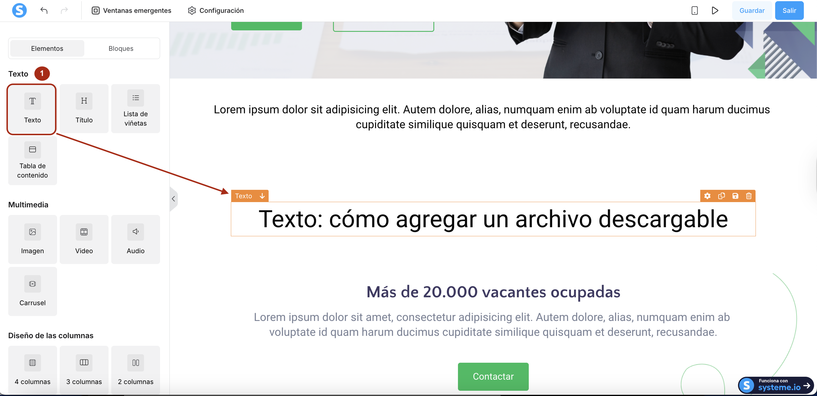 En el editor de página, arrastra el elemento Texto (1) desde el panel izquierdo y suéltalo en tu página.