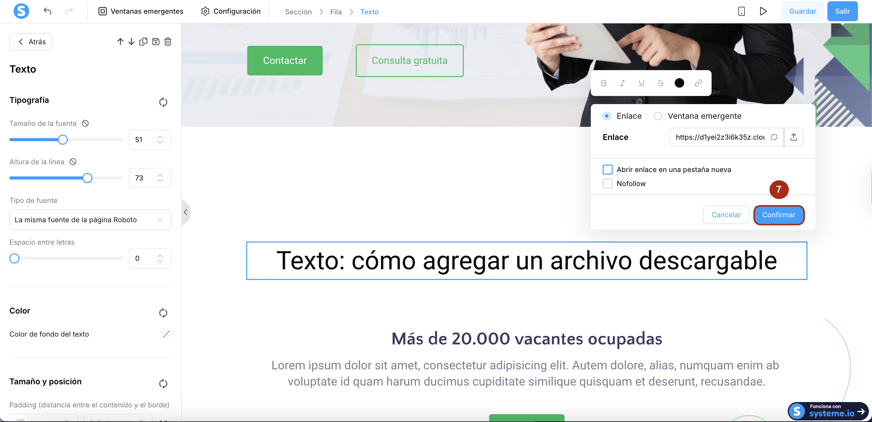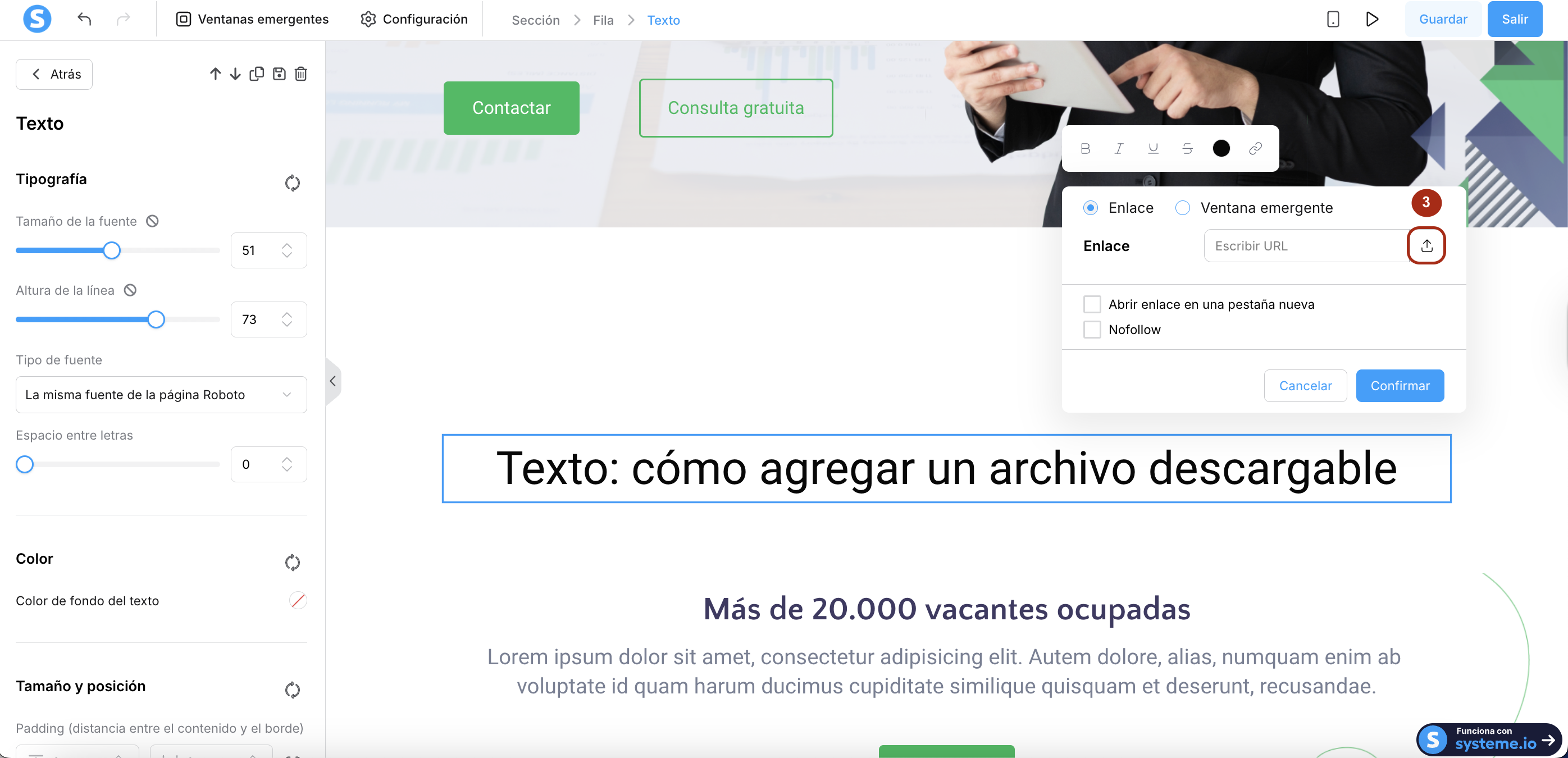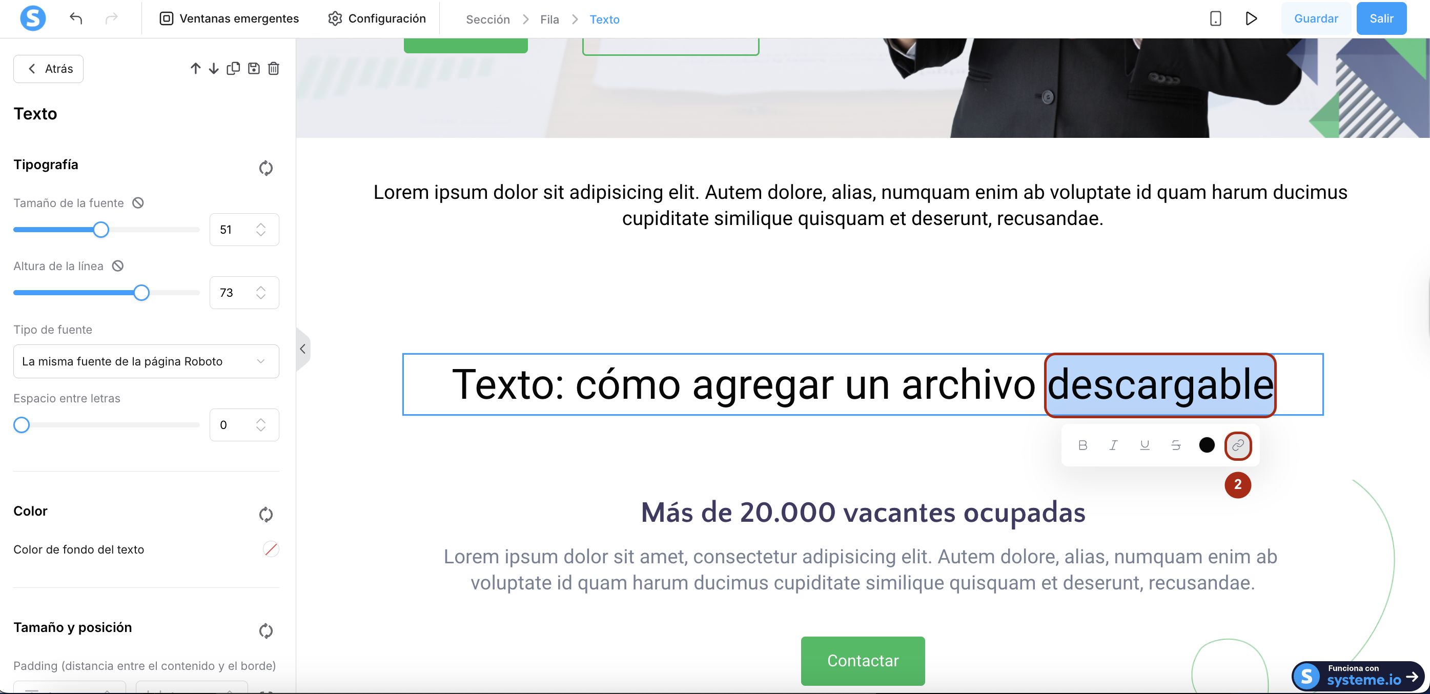 Selecciona el texto donde deseas agregar un archivo descargable, luego haz clic en el ícono del enlace (2).