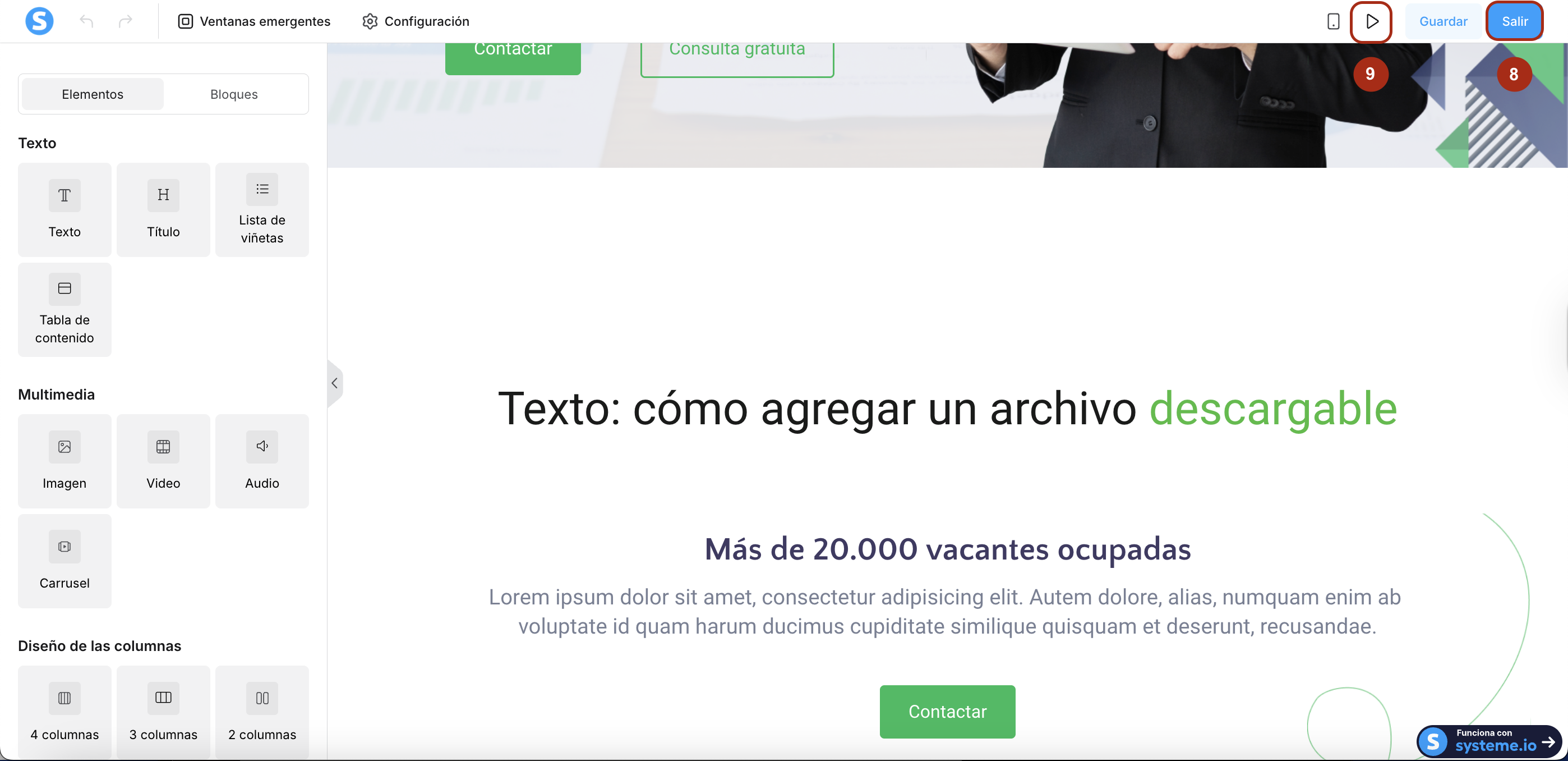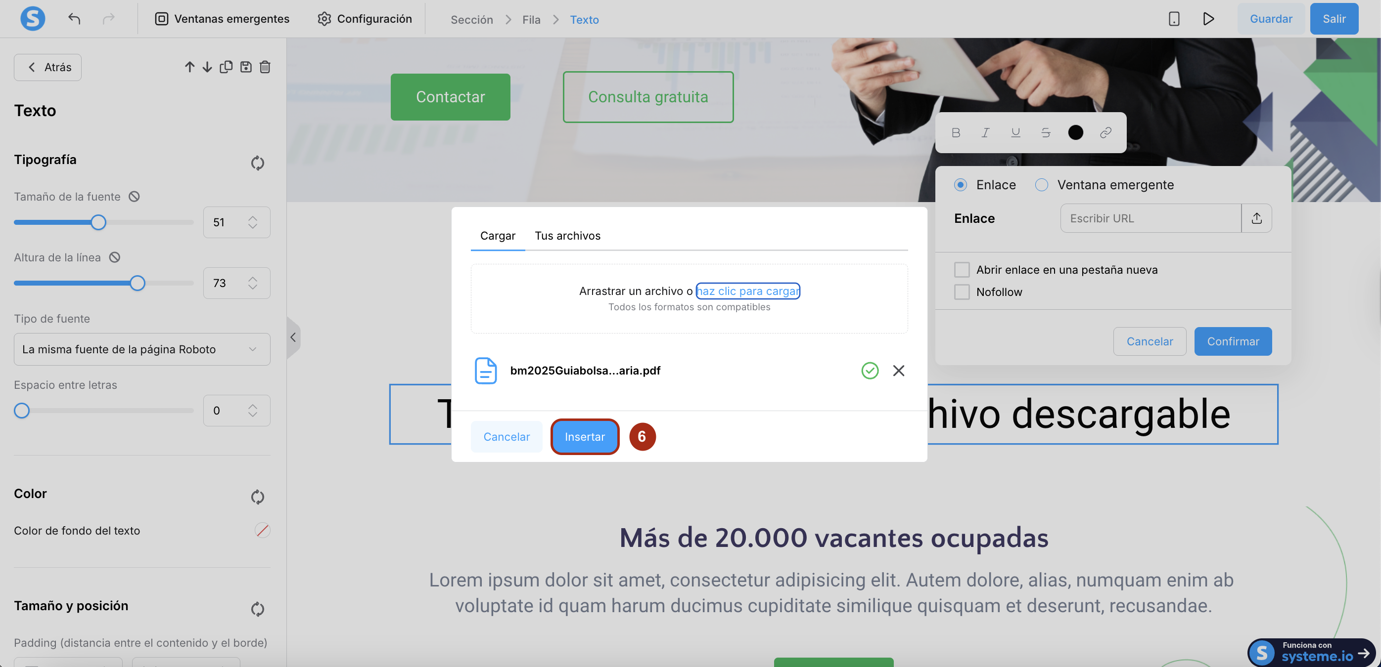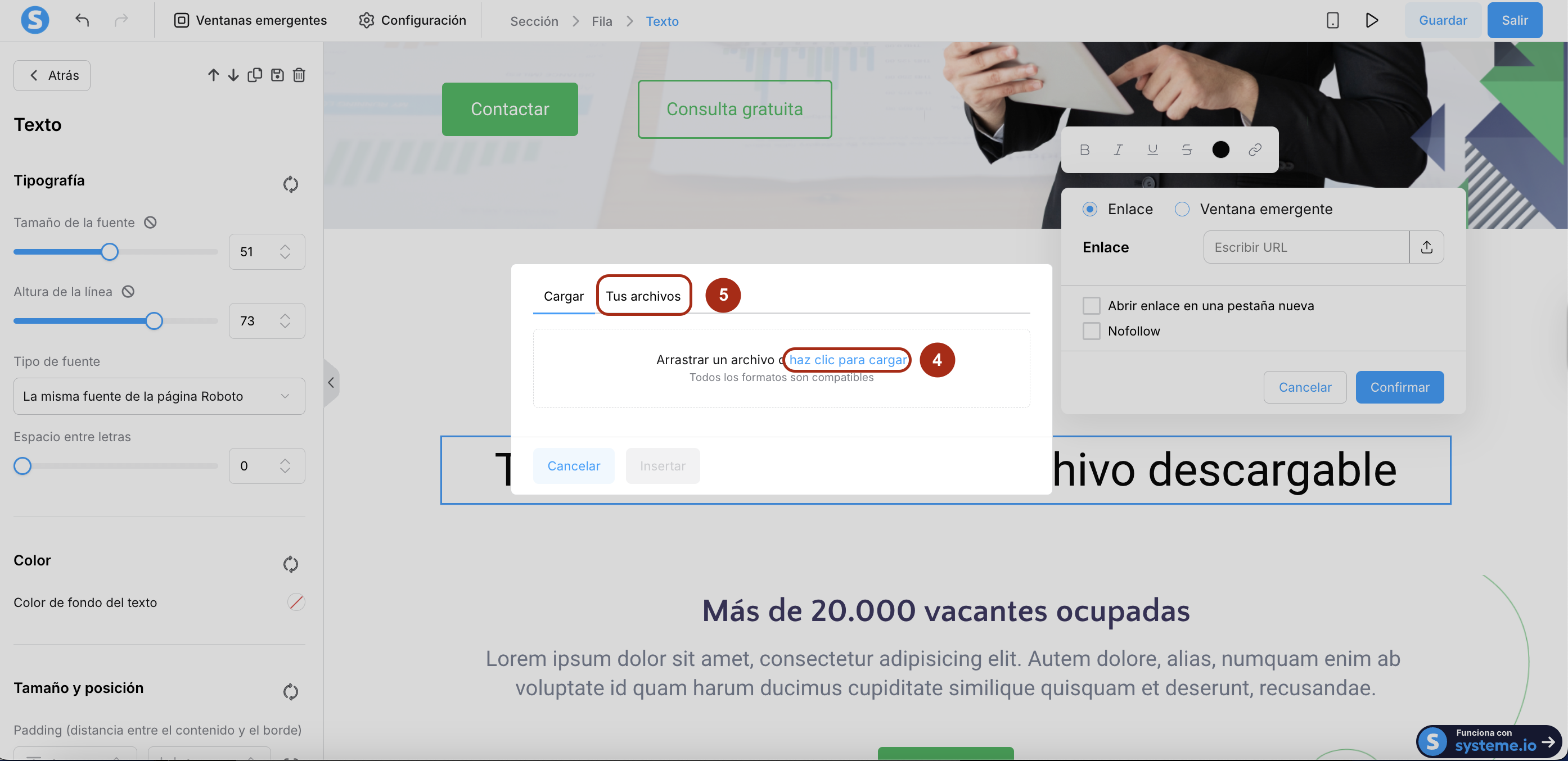De forma alternativa, selecciona un archivo ya guardado en tu cuenta de systeme.io (5).