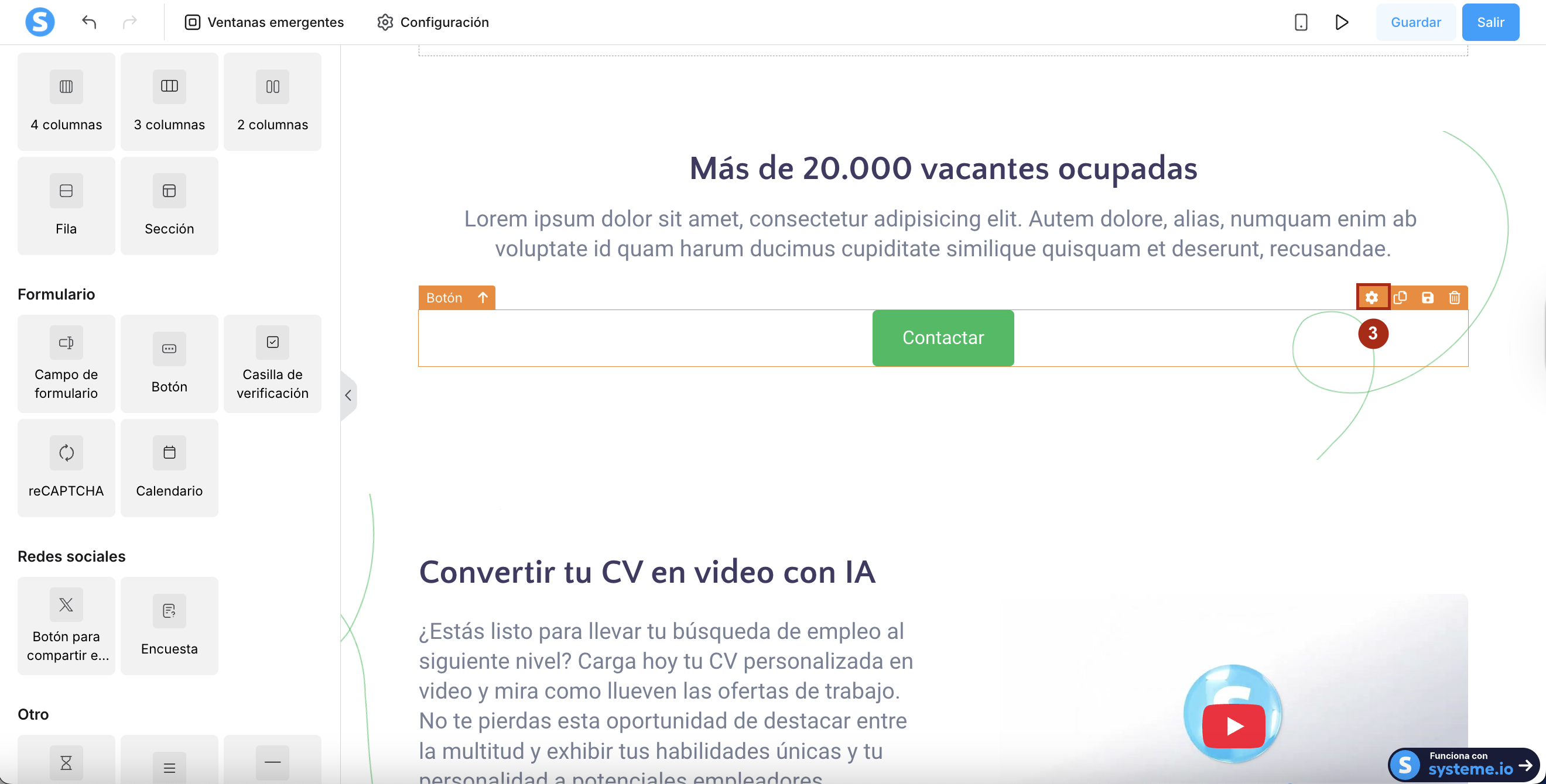 Para agregar subtexto debajo del texto principal del botón, abre la configuración del botón haciendo clic en el ícono de configuración (3).