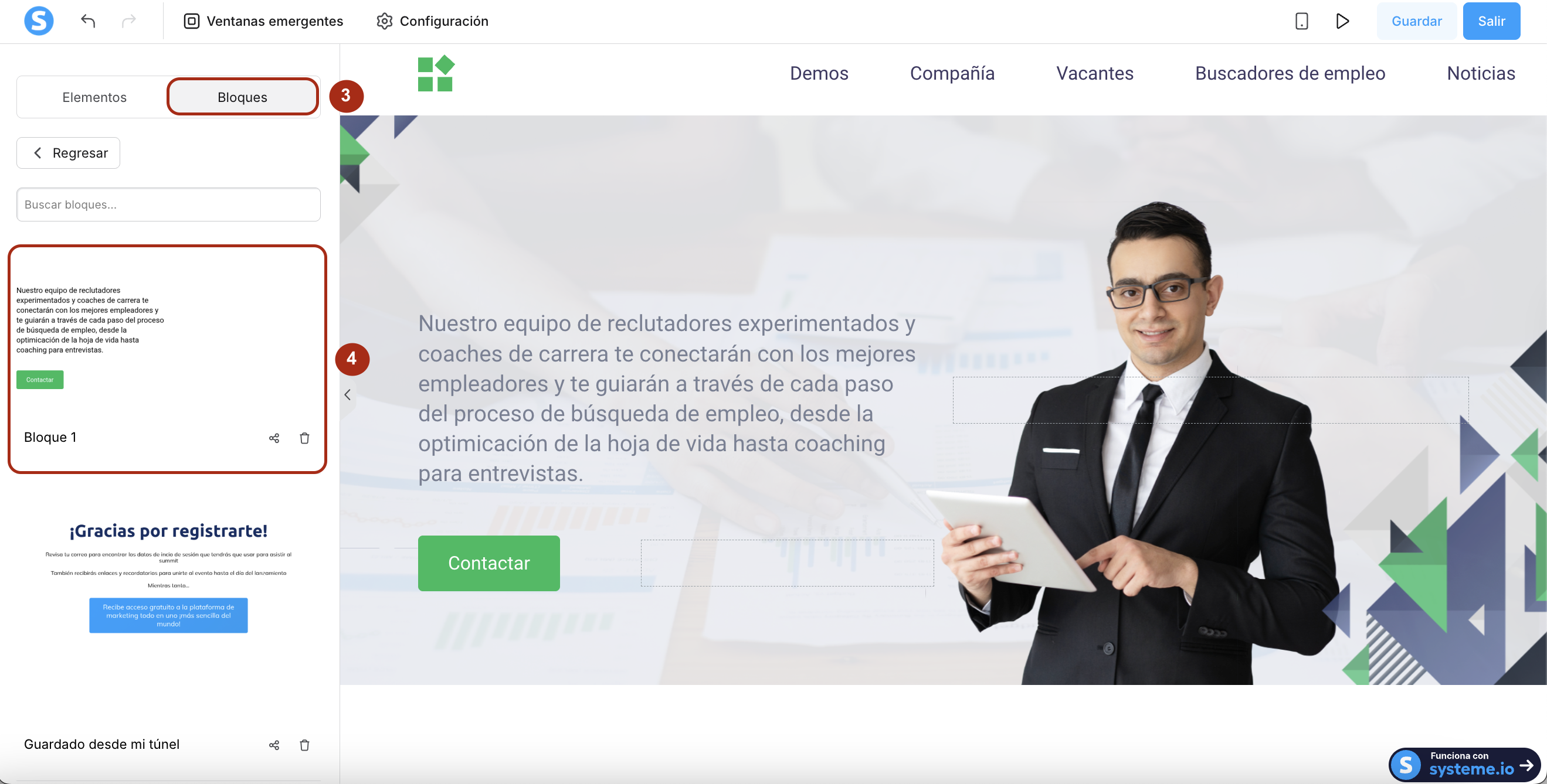 Para usar este bloque en otra página, abre el editor de página, haz clic en Bloques (3) y luego arrastra y suelta tu bloque guardado (4).