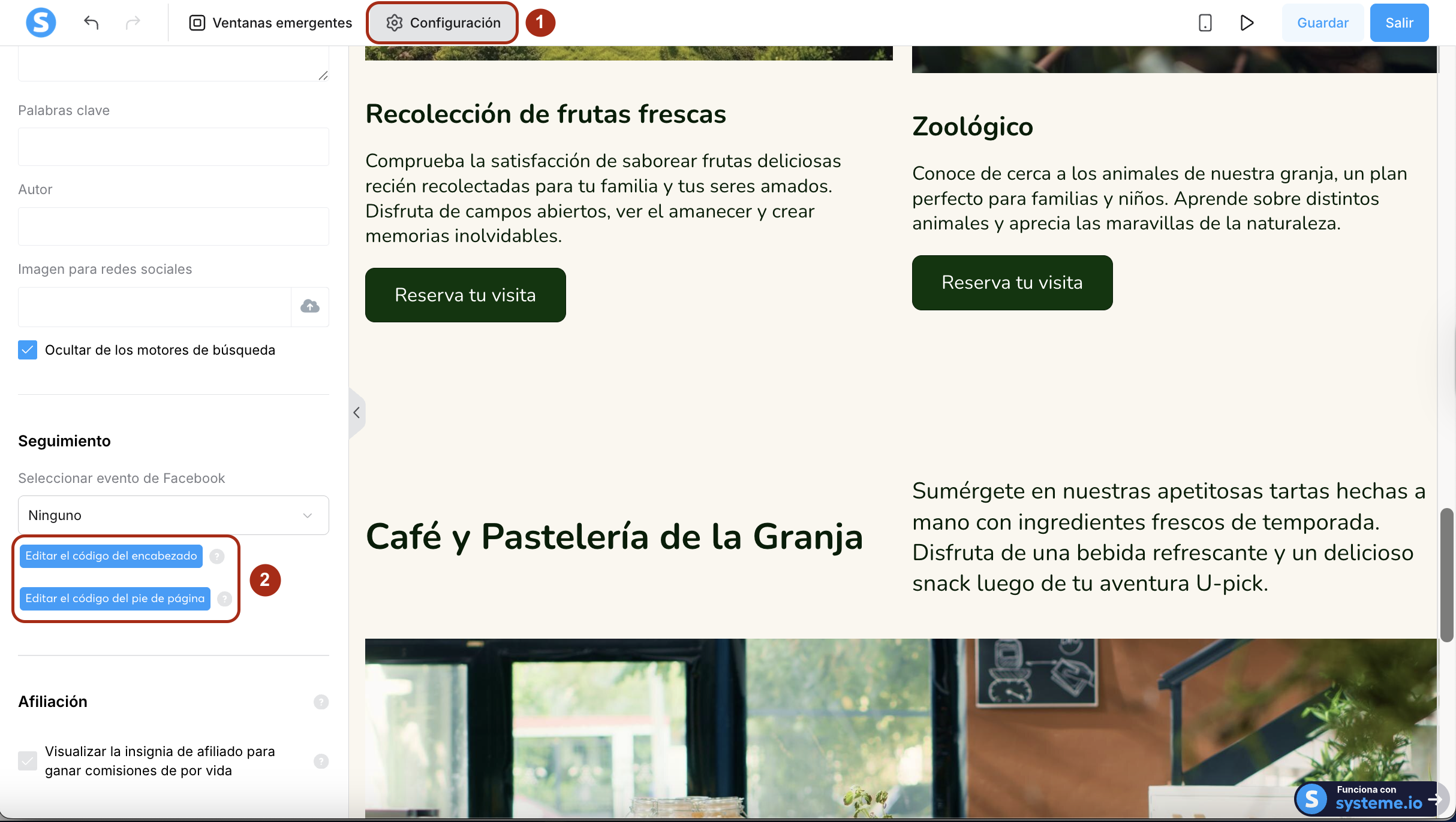 Para insertar el código de seguimiento de Meta, ve al túnel de ventas de la página donde quieres insertar el código.
