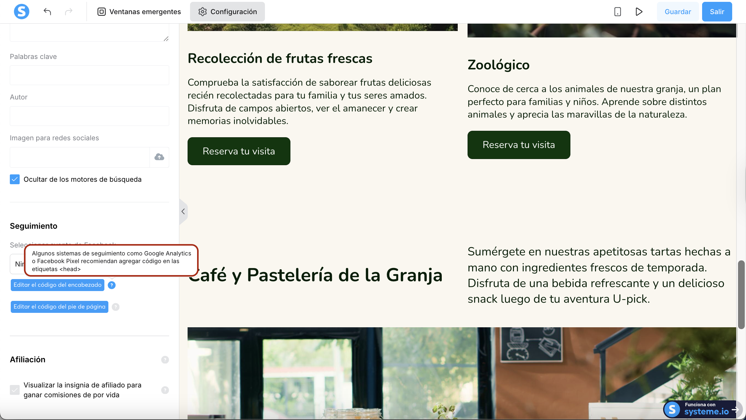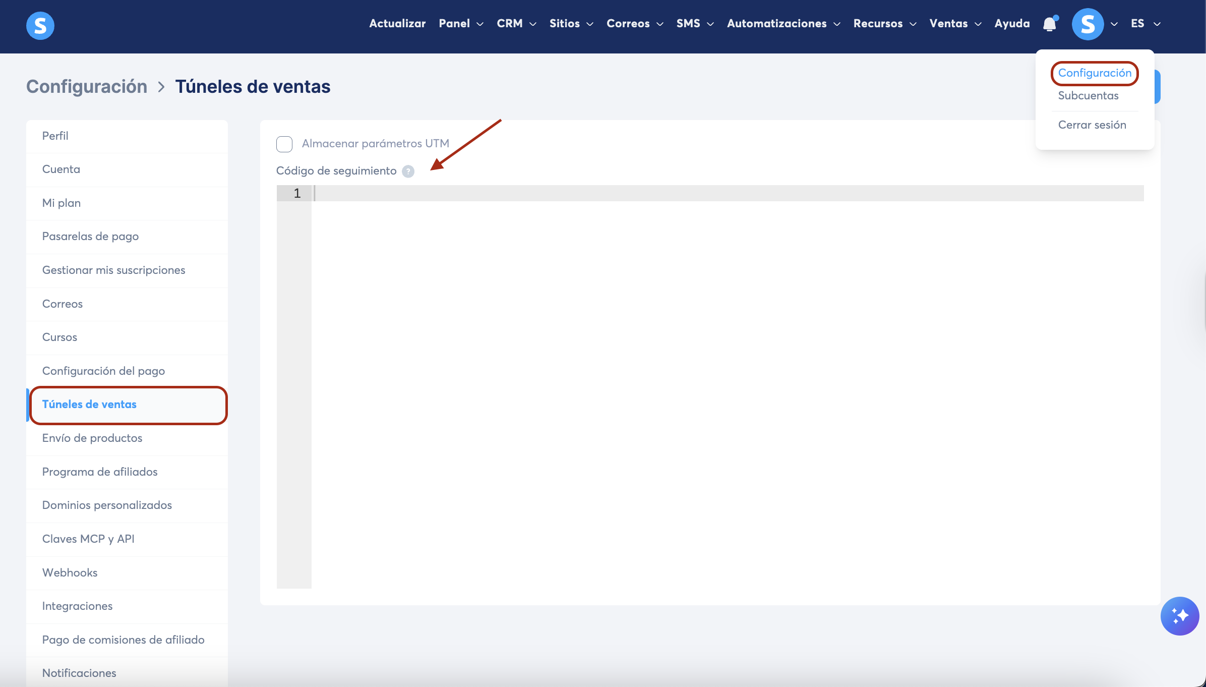 Para hacerlo, ve a tu foto de perfil, haz clic en Configuración y luego clic a la izquierda en Túneles de ventas. Pega el código de seguimiento en la casilla Código de seguimiento y haz clic en Guardar.