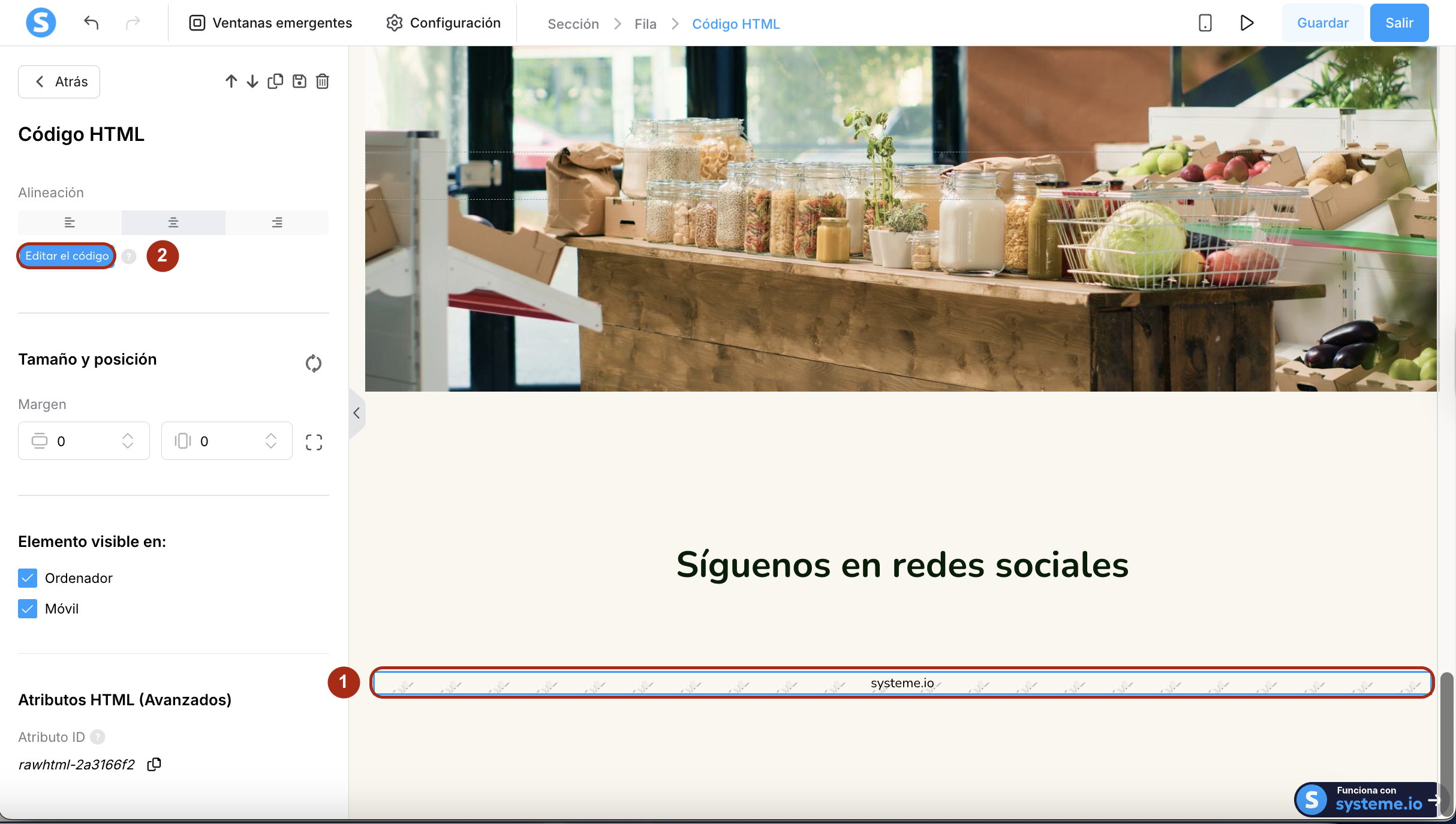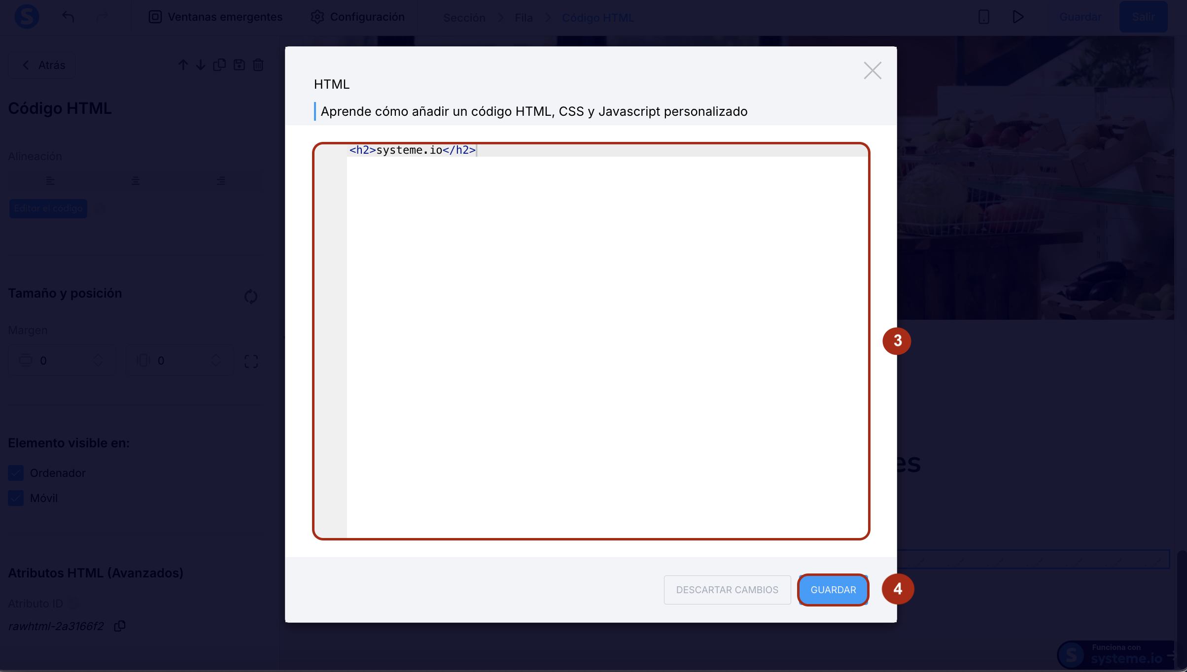 Agrega el código HTML en la casilla de texto (3), luego clic en Guardar (4).