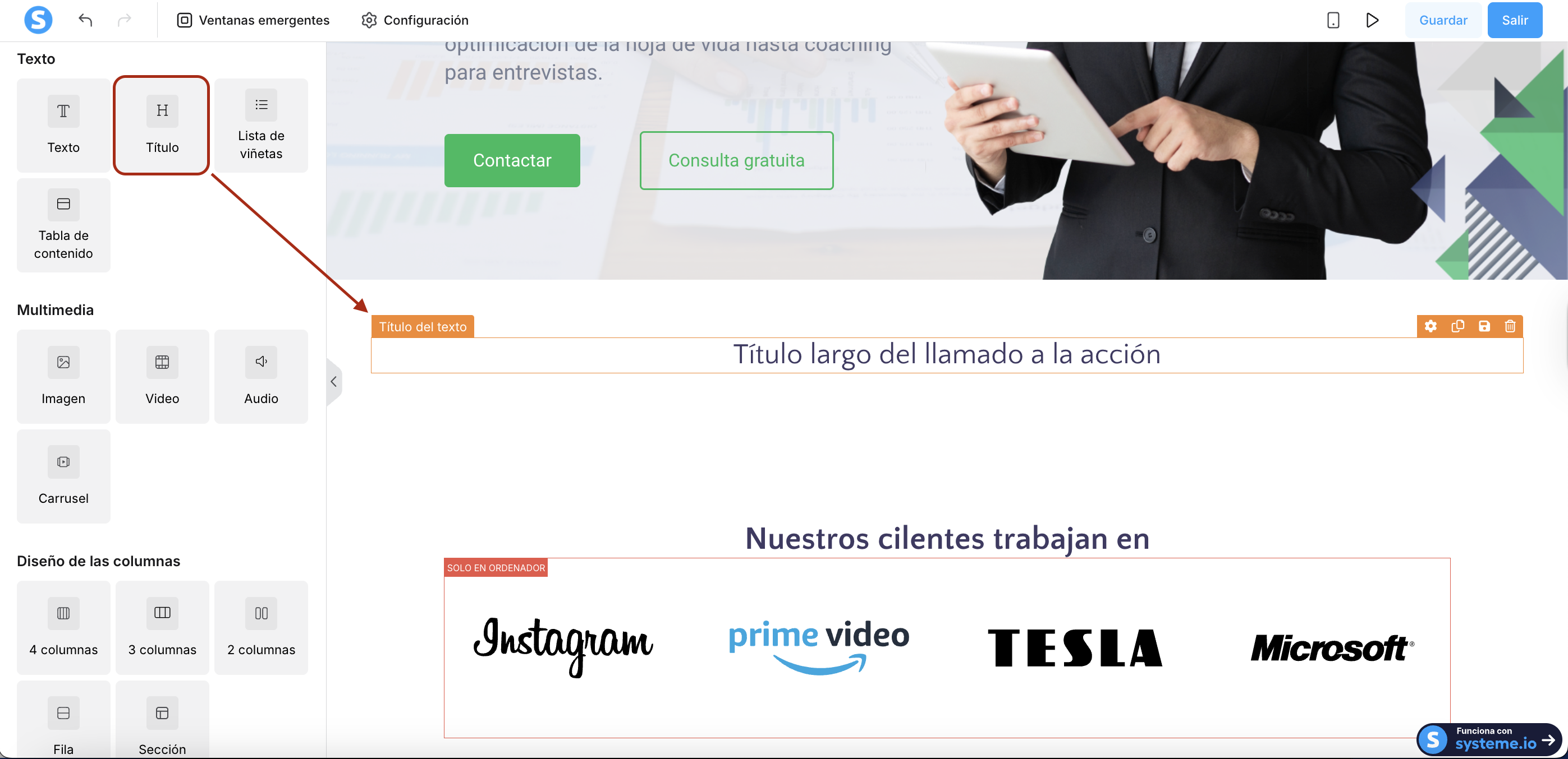 Para agregar un título, arrastra y suelta el elemento Título en tu página.
