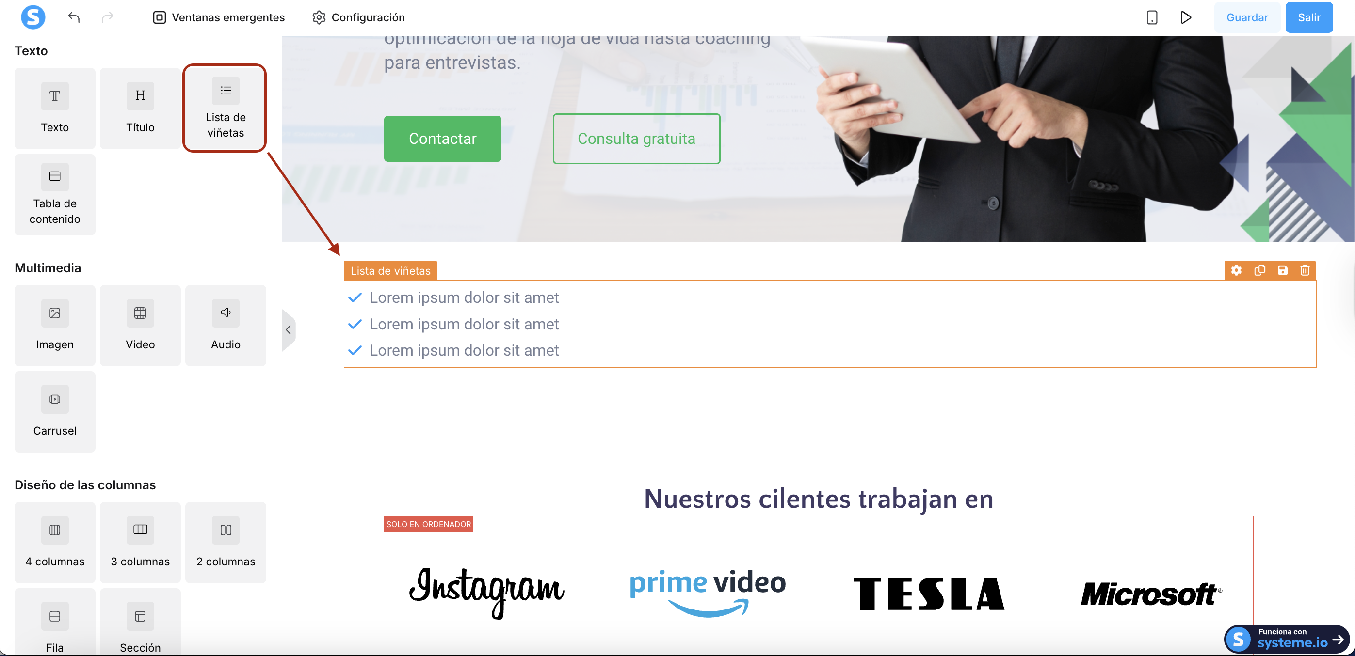 Para crear una lista, arrastra el elemento Lista de viñetas a tu página.