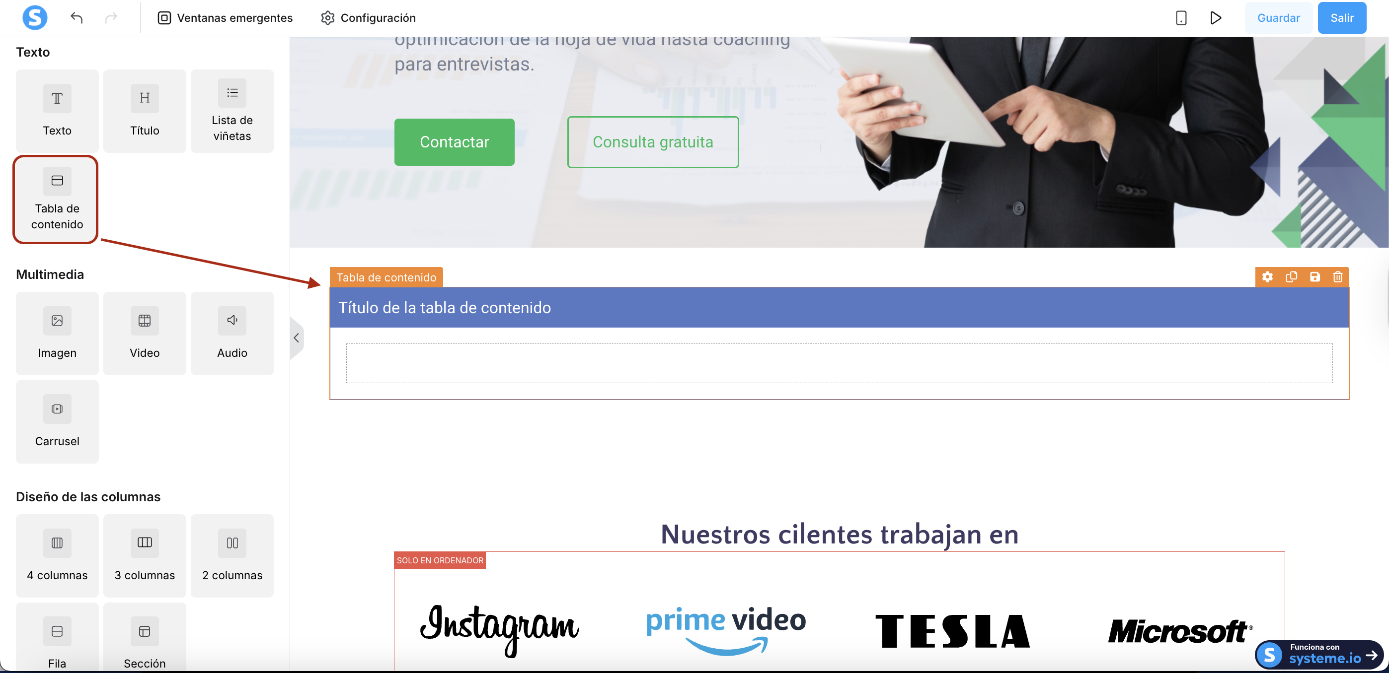 Usa una tabla de contenido para agrupar diferentes elementos. Simplemente arrastra el elemento Tabla de contenido y suéltalo en tu página.
