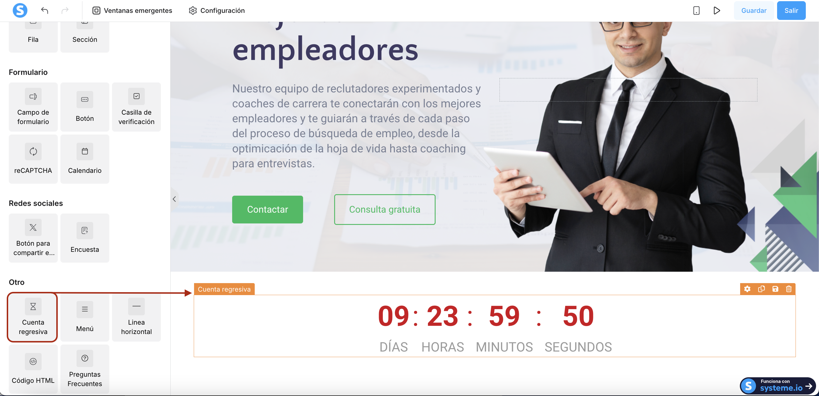 Ingresa al editor y arrastra y suelta el elemento cuenta regresiva desde el menú izquierdo a la página (1).