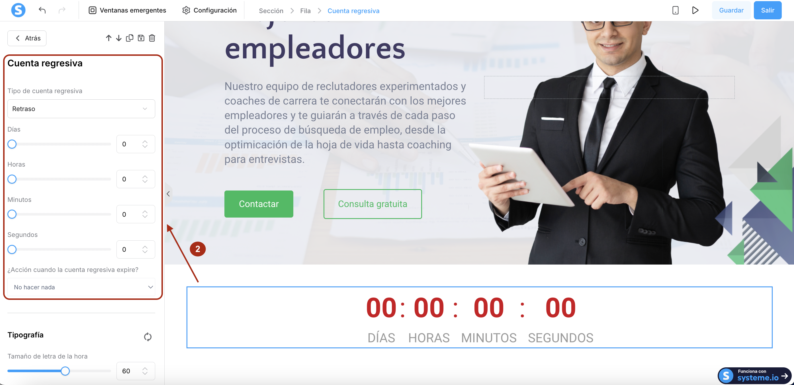 Haz clic en el elemento cuenta regresiva para abrir su configuración (2). Desde el menú desplegable Tipo de cuenta regresiva, selecciona Retraso.